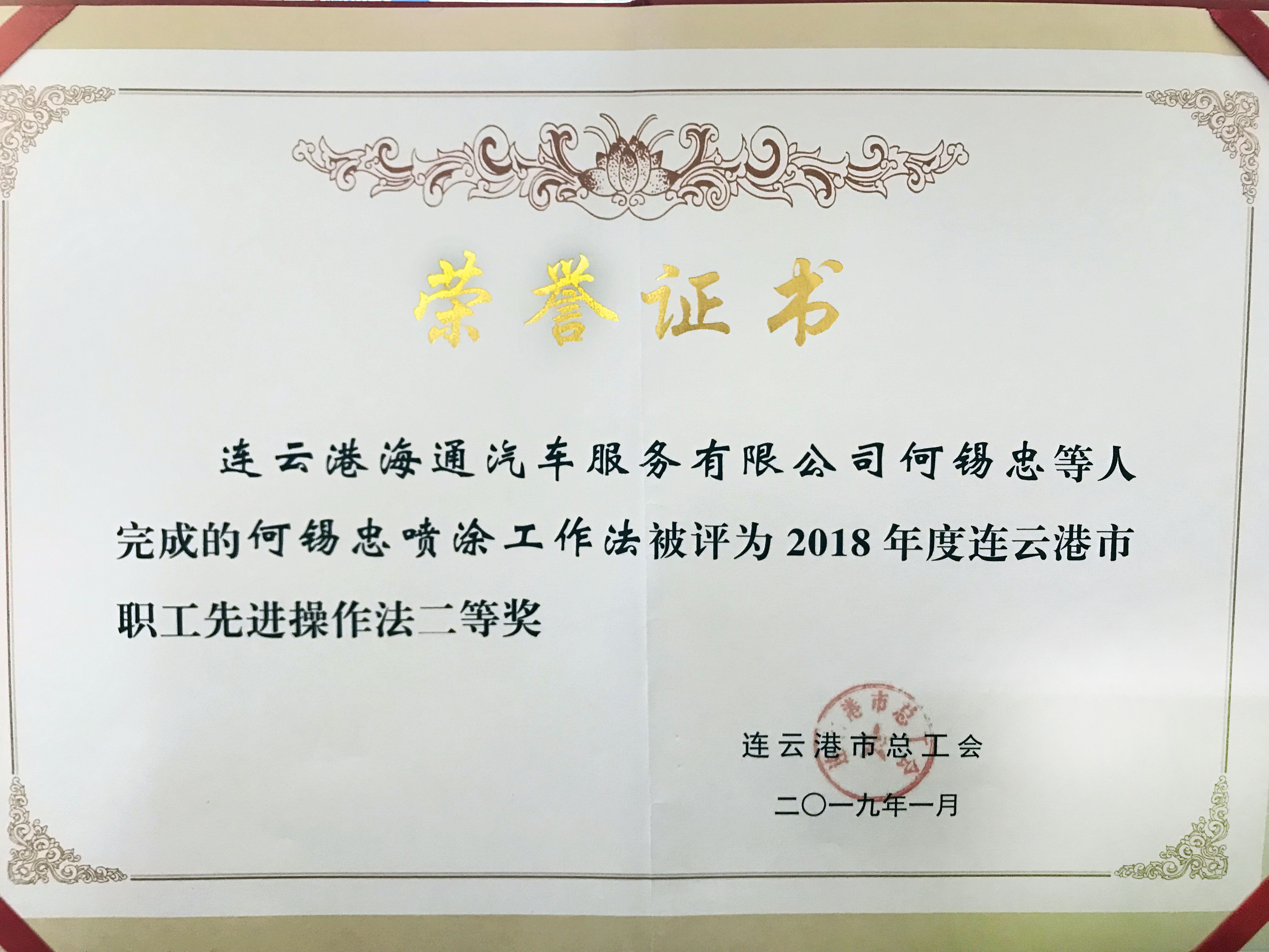为激发全市广大职工创新潜能和创造活力,促进企业技术进步和职工岗位成长,由市总工会主办的2018年度全市职工科技创新成果评比工作已结束。根据连工办发[2018] 67号《关于开展2018年度全市职工科技创新成果推荐申报工作的通知》要求,汽服公司申报的“何锡忠喷涂工作法”被市总工会评为2018年度连云港市职工先进操作法二等奖。