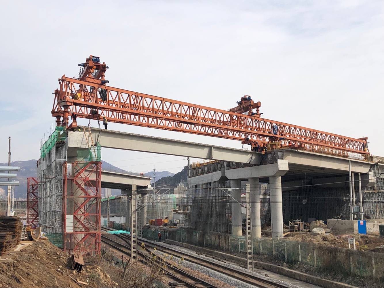 据市交通控股集团工程现场负责人王兵介绍:本次架设的箱梁是由中铁十局负责施工的右幅大桥第二联第二跨5-3预制箱梁、5-4预制箱梁。此处上跨的陇海铁路为国铁I级双线电气化线路,是我国横跨东西的重要干线铁路,列车班次密集,因此每天获批的架梁时间只有100分钟,这就要求架梁各道工序衔接必须精确无误。在施工前施工单位制定了专项施工方案,并组织施工人员严格按照流程进行演练,经过精心准备,确保了整个施工过程紧凑顺畅。主线桥首片箱梁跨陇海铁路成功架设标志着离242省道全线贯通这一年度目标又进一步。