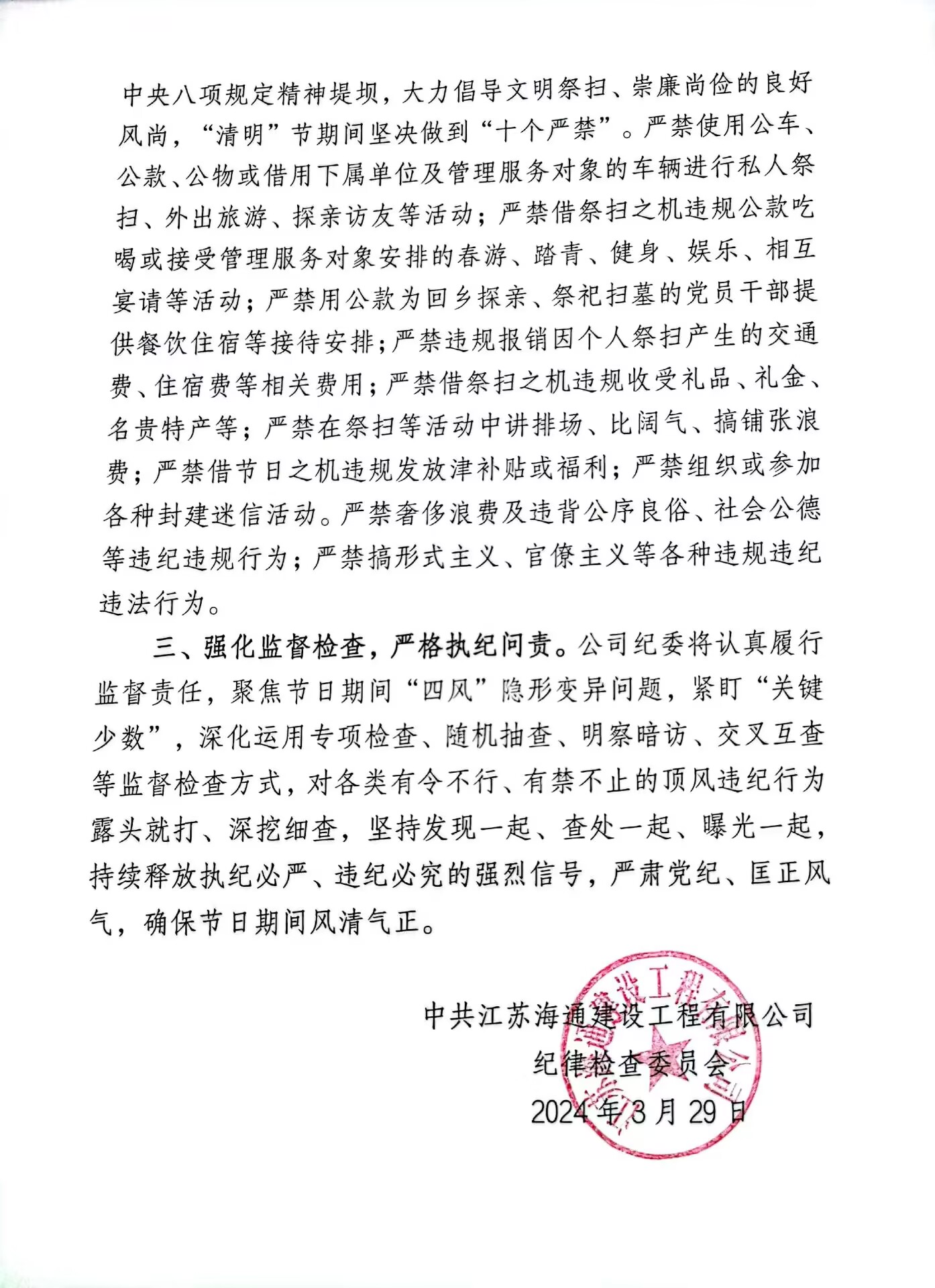 2024年清明节将至,为进一步严明工作纪律,严守廉洁防线,防止节日期间滋生“四风”问题,江苏海建公司纪委发出通知,提醒广大党员干部严格遵守中央八项规定精神,倡导廉洁、安全、文明、节俭、绿色的祭扫新风尚。