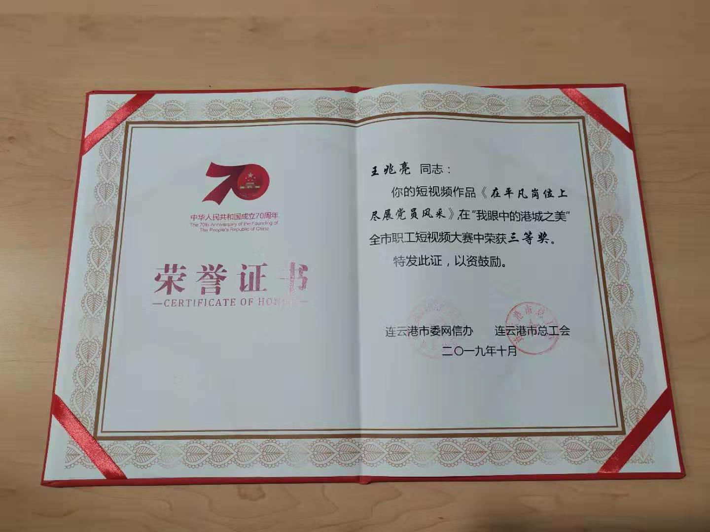 2019年是新中国成立70周年,为了充分展示新中国成立70周年以来连云港市取得的辉煌成就和创建全国文明城市的丰硕成果,同时,也为了进一步提升连云港市职工网络文化品质,满足广大职工网民日益增长的精神文化需求,构建清朗的网络空间,为连云港经济社会发展营造良好的网络舆论环境,市委网信办、市总工会于6月中旬联合开展全市职工庆祝新中国成立70周年——“我眼中的港城之美”网络主题宣传活动。修理公司王兆亮同志选送的短视屏《在平凡岗位上尽展党员风采》在“我眼中的港城之美”全市职工短视频大赛中荣誉三等奖。