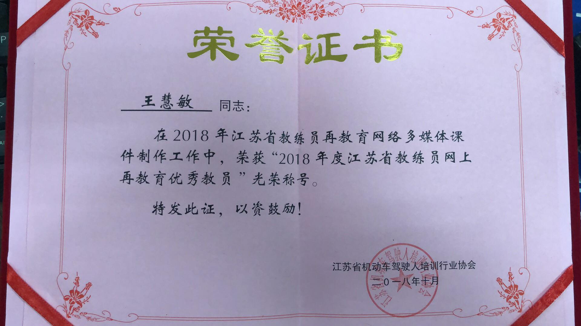 2018年10月,连云港市交通培训有限公司王慧敏同志在2018年江苏省教练员再教育网络多媒体课件制作中,荣获“2018年度江苏省教练员网上再教育优秀教练员”光荣称号。
