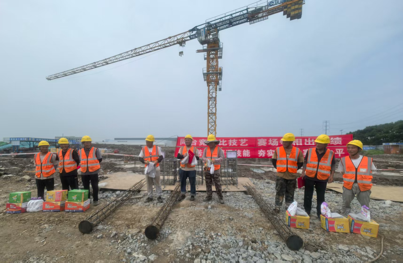 9月15日,现代物流携手施工单位和监理单位在施工现场举行钢筋绑扎技术比武大赛,来自劳务钢筋组的九名技术能手同台竞技,一展风采。