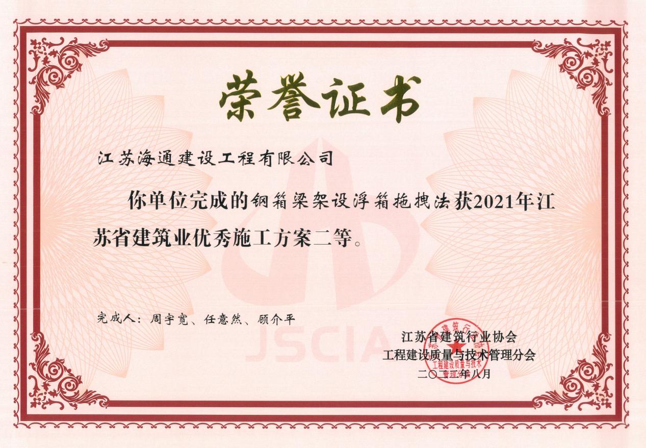 近日,江苏省建筑行业协会《关于发布2021年江苏省建筑业优秀施工方案评价工作结果的通知》(苏建质协[2022]10号)文件中获悉江苏海建公司申报的《钢箱梁架设浮箱拖拽法施工方案》荣获2021年度江苏省建筑业优秀施工方案等奖。