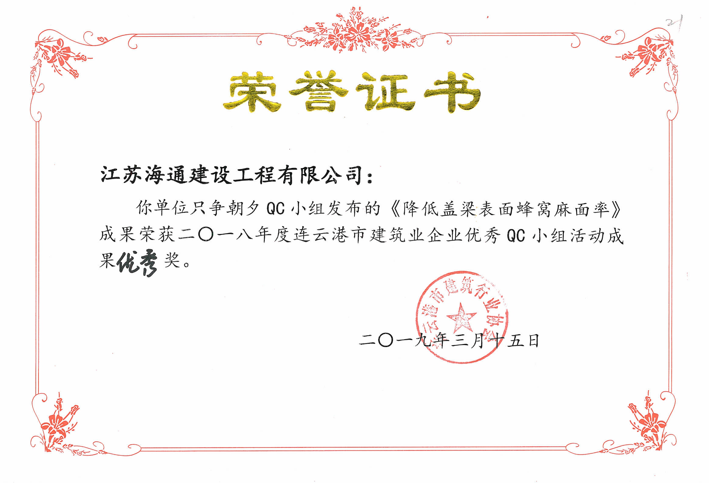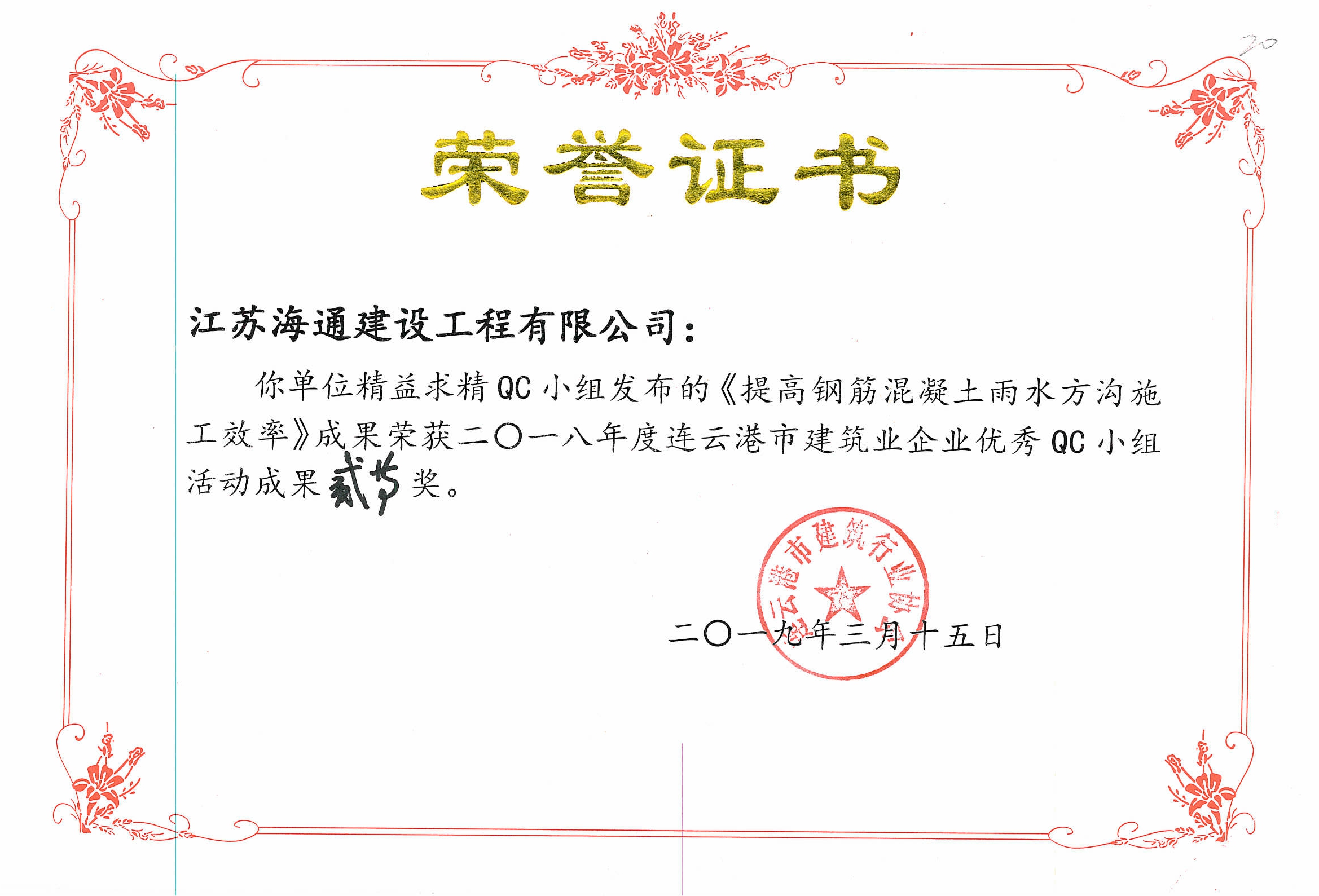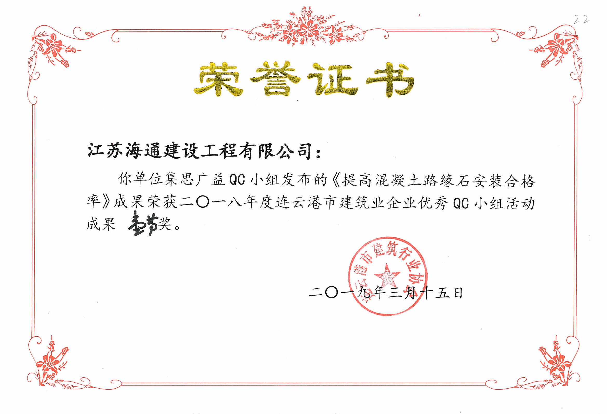3月15日,从连云港市建筑业2018年度优秀QC小组活动成果发布会上传来捷报,江苏海建公司集思广益QC小组的成果《提高混凝土路缘石安装合格率》荣获成果发布一等奖,精益求精QC小组的成果《提高钢筋混凝土雨水方沟施工效率》荣获成果发布二等奖,只争朝夕QC小组的成果《降低盖梁表面蜂窝麻面率》获得成果发布优秀奖。