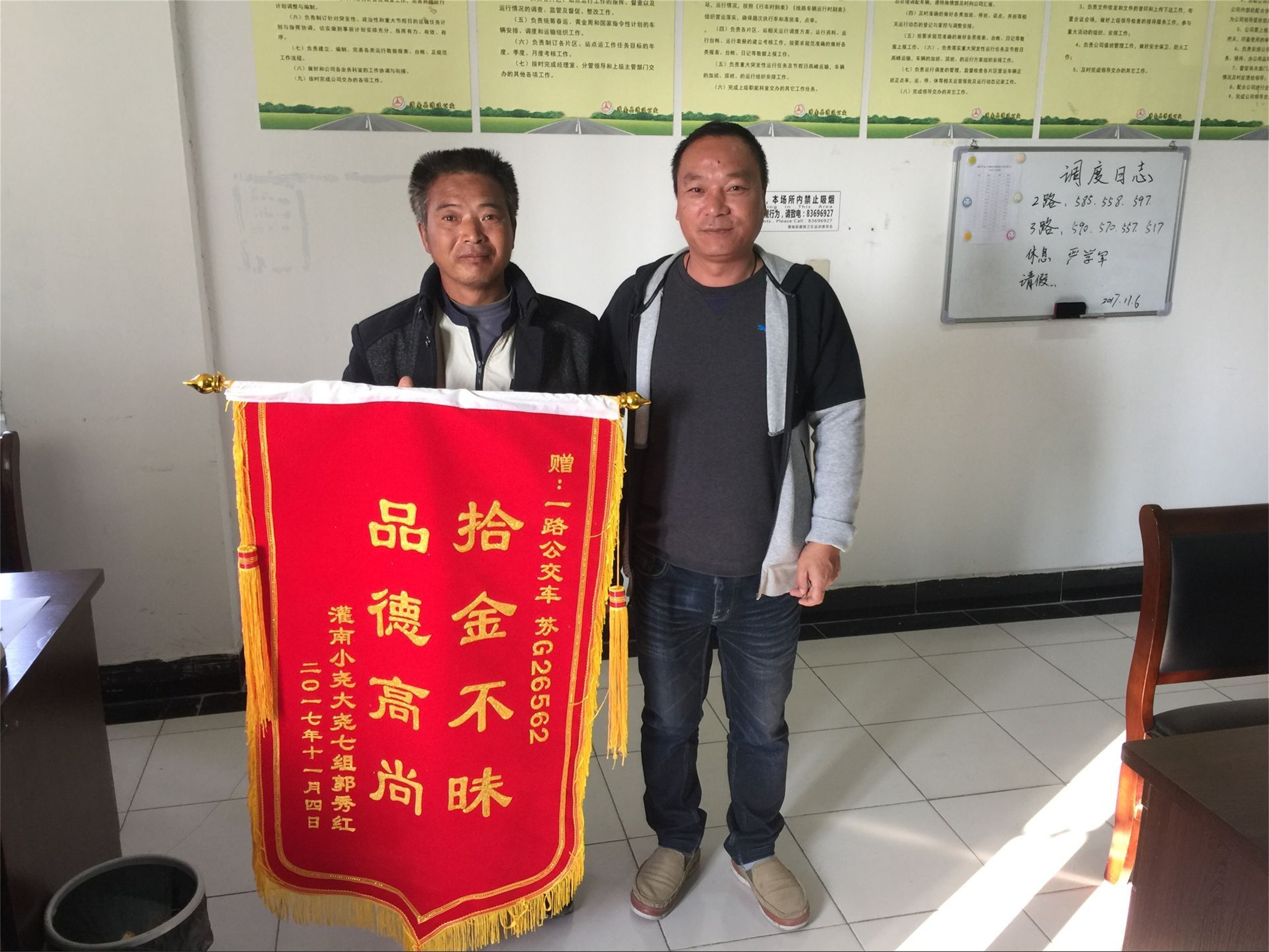 2017年11月7日上午,乘客郭先生来到连汽灌南公司灌通城市公交公司办公室,送来一面写有“拾金不昧,品德高尚”的锦旗,表达自己对1路公交(苏G26562)驾驶员凡正峰将拾金不昧的感激之情。
