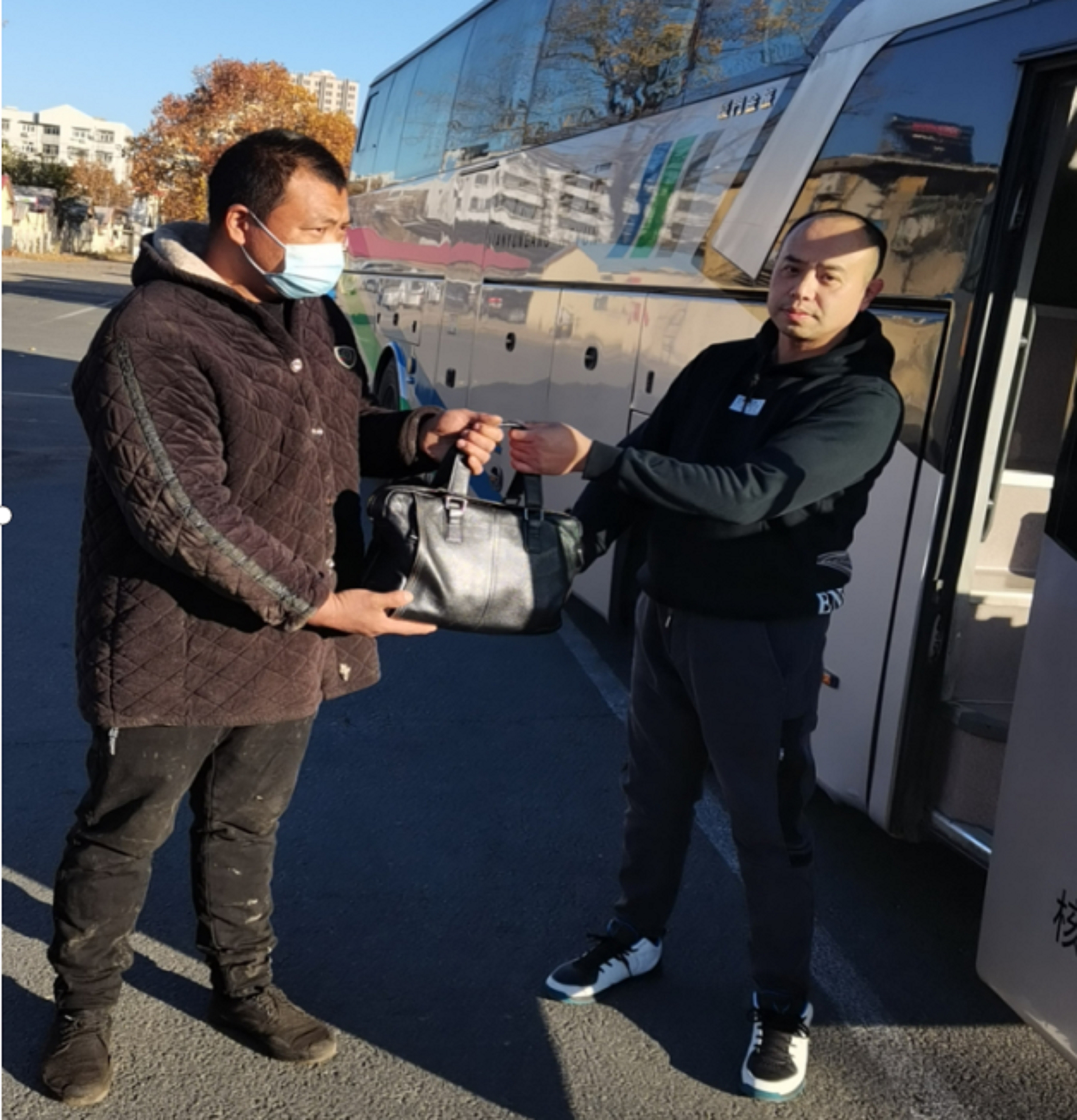 11月29日,上海至东海班车到达东海客运站时,驾驶员舒志坚师傅打扫卫生时,在座位上发现一个黑色皮质包,打开包后,看到里面有一沓现金、银行卡、2张证件等。舒师傅急忙跑下车,并没有发现失主,想着失主肯定万分着急,舒师傅第一时间将包送至客运科,方便失主前来认领。同时让值班站长安排出站口服务人员逐一询问出站旅客,经过多方寻找未果。就在这时客运科接到一位乘客的电话,称自己携带的包丢了,包内有现金、银行卡等,请求帮忙寻找,听着电话里焦急的声音,经过信息的核对,告知失主包已找到,包里面的东西都没有少,让他放心。