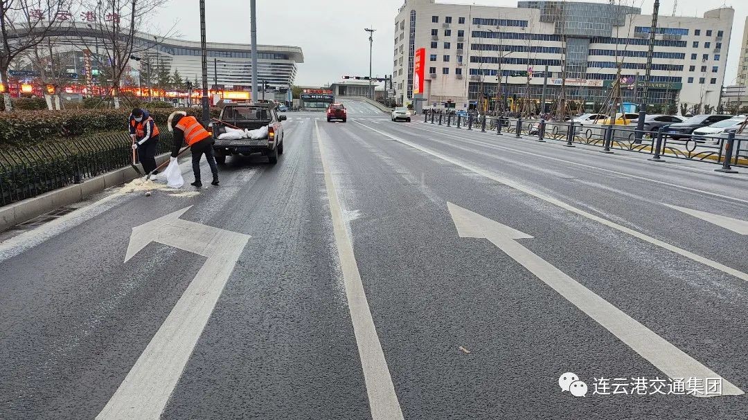 综合客运枢纽执行全天候除雪防滑备勤预案,在人行道、进站口匝道等多处抛洒融雪剂,必要时将进行除冰作业,防止由路面结冰导致的车辆打滑、旅客摔倒。保障电子线路稳定,确保电子大屏运行正常,并力保春节亮化工程如期完工;港城大道、新墟互通、朝阳互通等道路及匝道,及时全面抛洒融雪剂,消除路面冰患;石梁河水库全部项目停止作业,采运砂船舶、养殖作业船舶全部停靠码头,并对船舶内管线进行保温处理……
