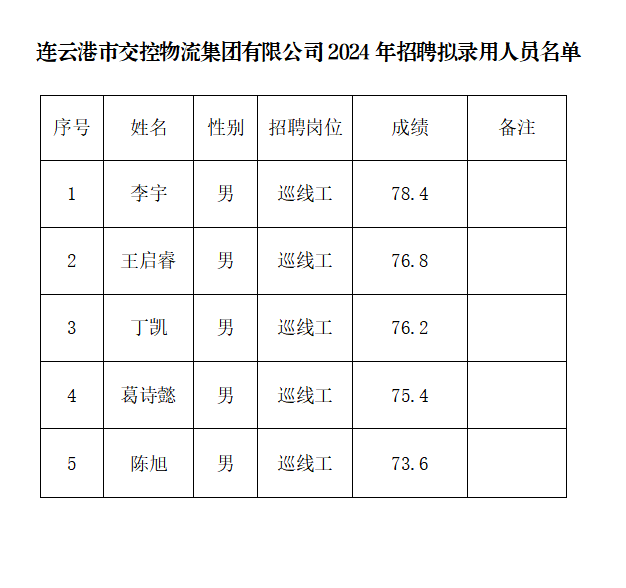 根据连云港市交控物流集团有限公司2024年招聘简章有关规定和要求,现将本次招聘拟录用人员名单予以公示。