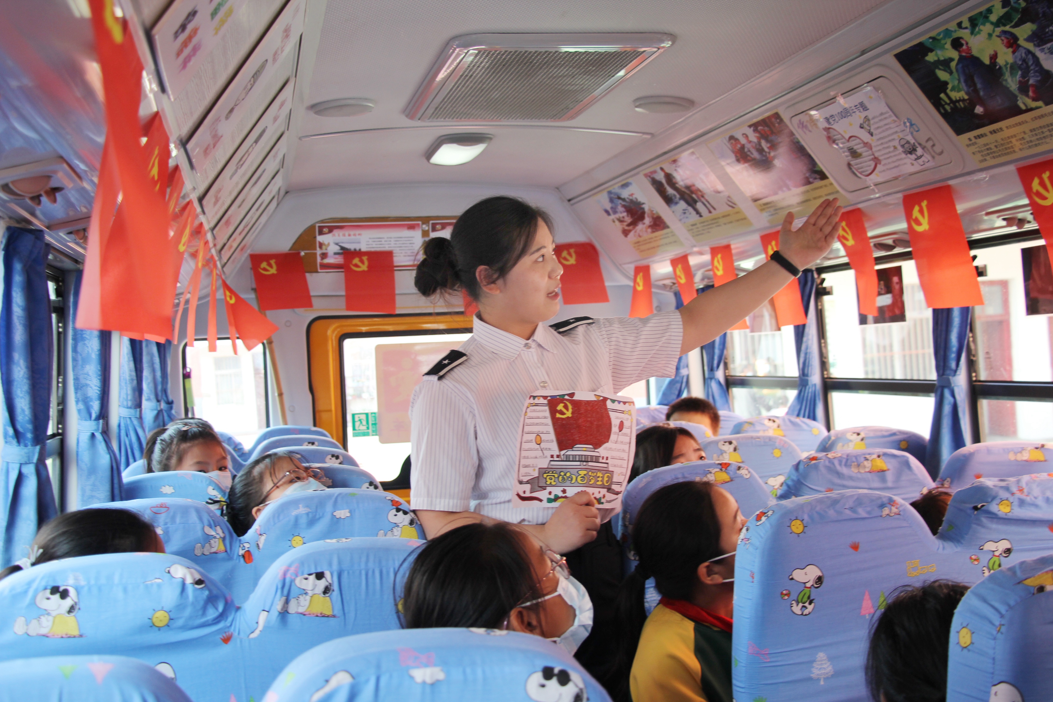 为了进一步推进校车主题车厢的建设,连汽灌云欣达校车在沂北中心小学打造苏GV7359党史教育示范车,学生在乘车上下学过程中,一边乘坐校车一边听照管员讲解党史知识,照管员细致的讲解让孩子们对党史学习产生了浓烈的兴趣。