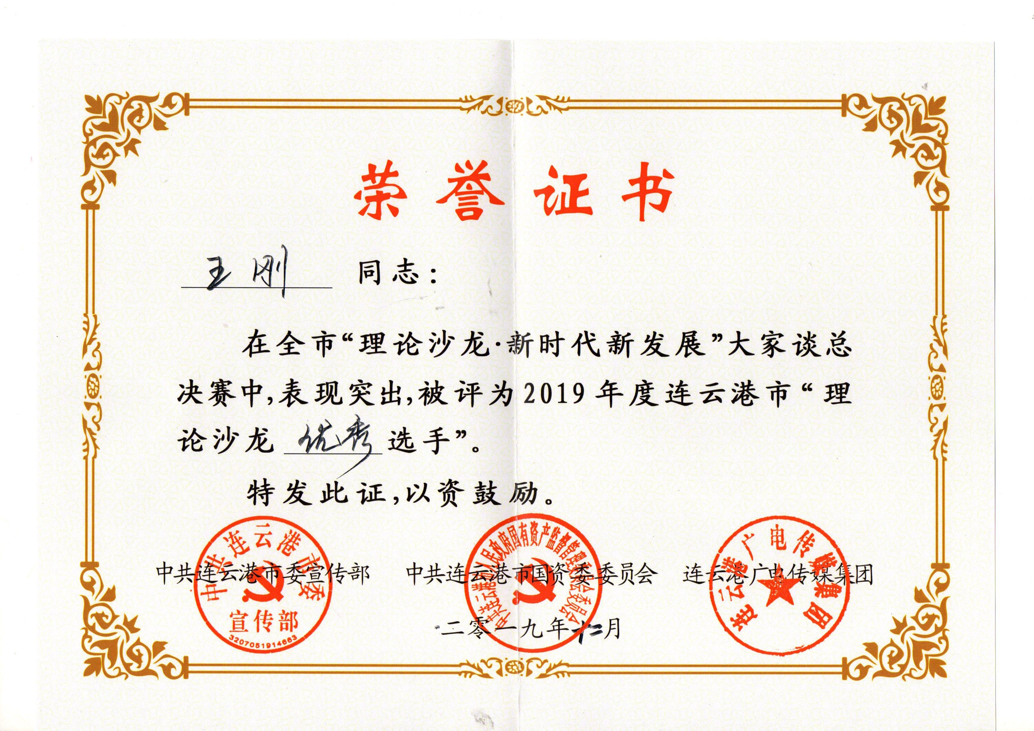 为更好地学习宣传贯彻习近平新时代中国特色社会主义思想和党的十九大精神,创新企业思想政治工作,推进企业干部职工认真学习科学理论,积极投身“高质发展、后发先至”实践,市委宣传部、市国资委党委、连云港光电传媒集团联合举办“理论沙龙.新时代新发展”大家谈活动。修理公司王刚同志经层层选拔,在1月7日的决赛中,因表现突出,被评为2019年度连云港市“理论沙龙优秀选手”。
