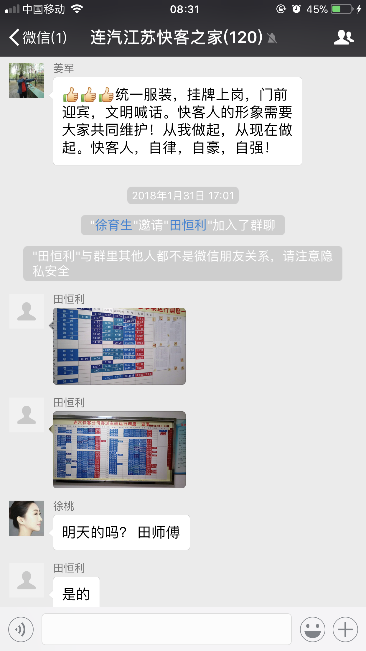 这是快客公司的员工微信群,每天各个科室会及时将春运工作提示发布到微信群,并快速回答员工的询问;发现各种的不良苗头,第一时间发布出来,给大家提个醒;坚持每天推出第二天的调度安排,让驾驶员提前知道明天的行车计划,将每个的闪光点通过照片展示出来,给坚守一线的驾驶员打气鼓劲,这是连汽快客公司运用微信群在春运期间的安全神器。