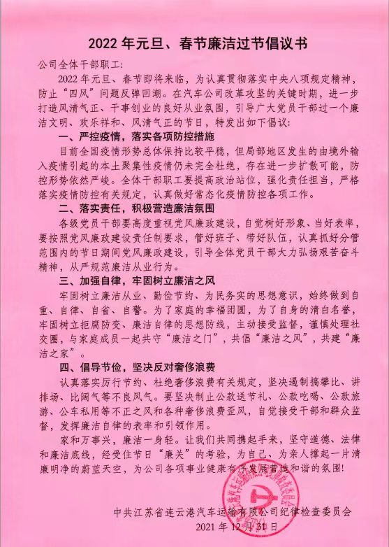 为认真贯彻落实中央八项规定精神,坚决抵制奢侈浪费歪风,防止“四风”问题反弹回潮,引导广大党员干部过一个廉洁文明、欢乐祥和、风清气正的节日。12月底,汽车公司纪委向权属单位下发了《关于加强2022年元旦春节期间作风建设的通知》,并向全体干部职工发出了“两节”廉洁过节倡议书。
