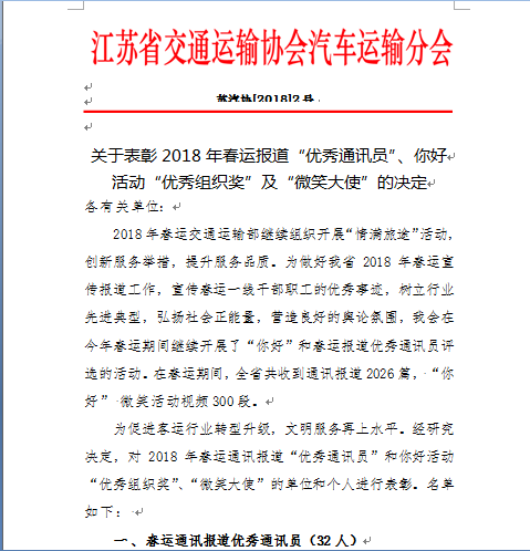 4月23日,从省交通运输协会获悉,连汽快客公司万燕、新浦汽车总站周承君、张浩3人获评省交通运输协会2018年春运报道“优秀通讯员”。
