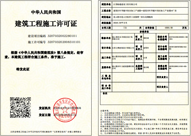 9月2日,海建公司板桥工业园建筑材料节能环保深加工产业园项目顺利拿到由连云经济开发区行政审批局发布的《中华人民共和国建设工程施工许可证》,许可证的颁发对我公司板桥工业园项目建设规划的可行性予以批准,完善了该项目的施工手续,为该项目的顺利完工提供了强有力的支持。