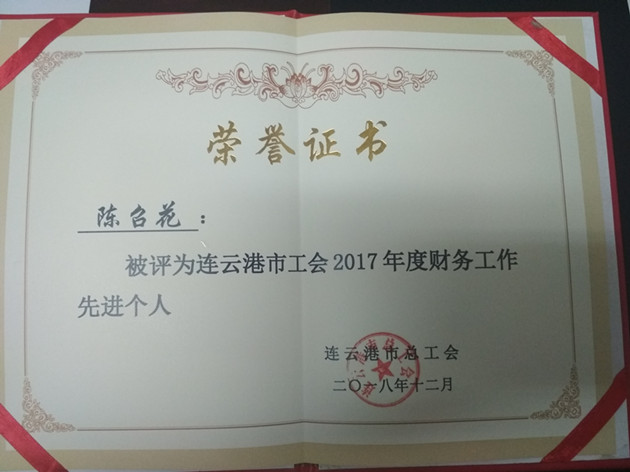 年度财务工作优秀单位”;陈召花同志被评为“连云港市工会