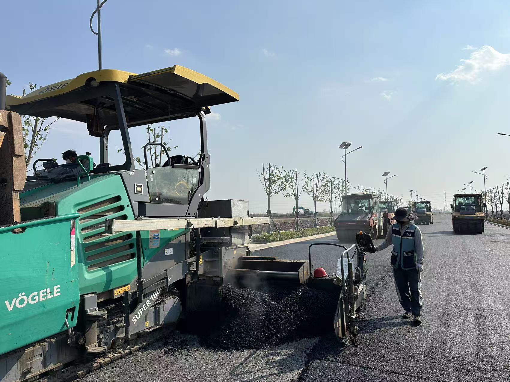 沥青摊铺现场:与高温“共舞”,铺就畅行之路。清晨,城市还未完全苏醒,上合物流园圩河东路路段的沥青施工现场已热气蒸腾。摊铺机缓缓前行,将160℃的沥青混凝土均匀摊铺,压路机来回穿梭压实路面,热浪裹挟着刺鼻的沥青气味扑面而来。沥青摊铺对温度要求极高,必须在140℃以上完成碾压,否则密实度就不达标。施工现场负责人王洁手持温度检测仪,紧盯摊铺温度。“虽然错过假期陪伴家人,但看到道路一天天成型,再苦再累也值得!”质检人员同步跟进,用专业设备检测平整度、厚度等指标,确保每一寸路面都达到设计标准。