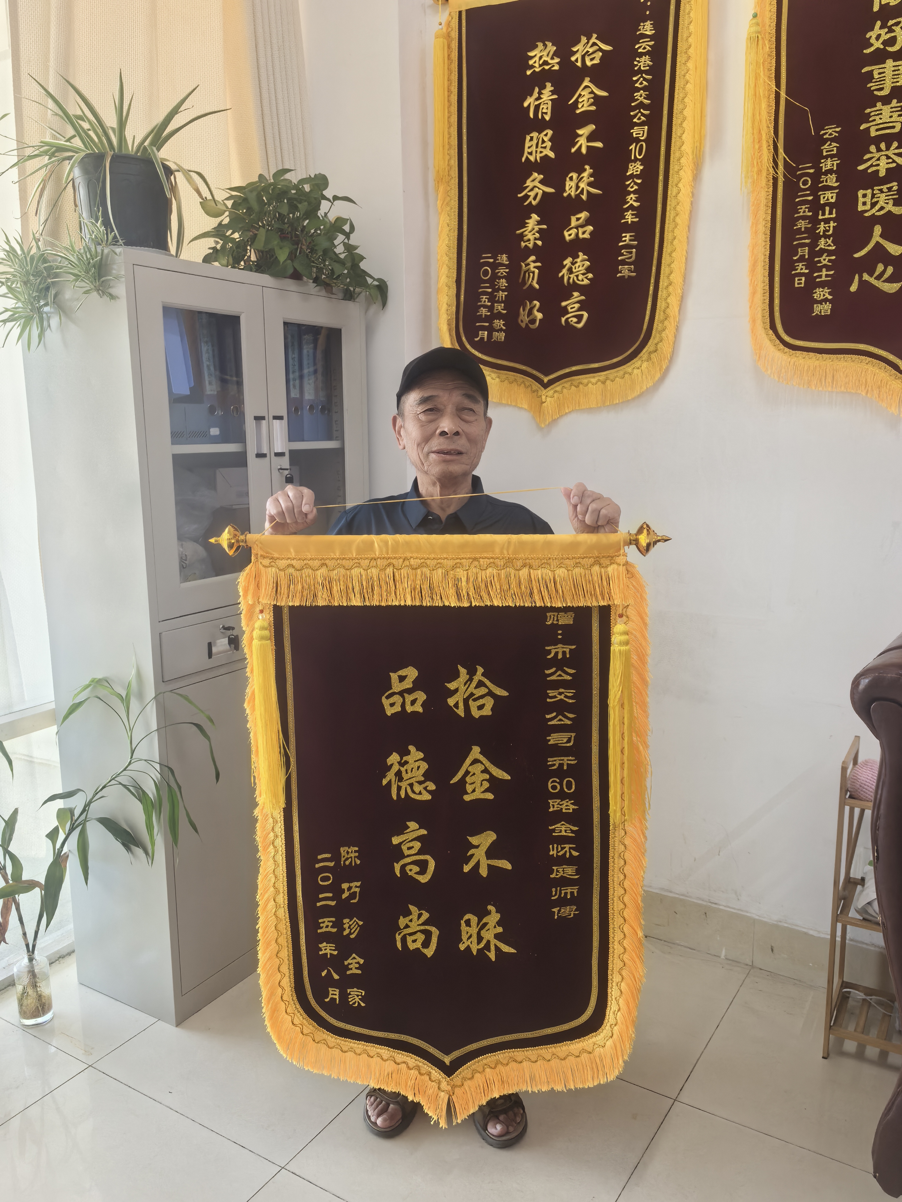 8月18日上午,一位年过七旬的老人将一面锦旗送至公交集团新华公交场站车队办公室,对60路驾驶员金怀庭表达感激之情。