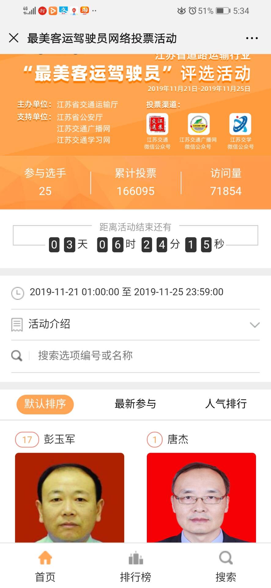 此次评选活动将从道路旅客运输驾驶员和道路货物运输驾驶员各25名候选人中,通过“江苏交通”、“江苏交通广播网”、“江苏交通学习网”微信端对50名候选人开展网络投票评选,最终选出最美道路旅客运输驾驶员和最美道路货物运输驾驶员各10名。