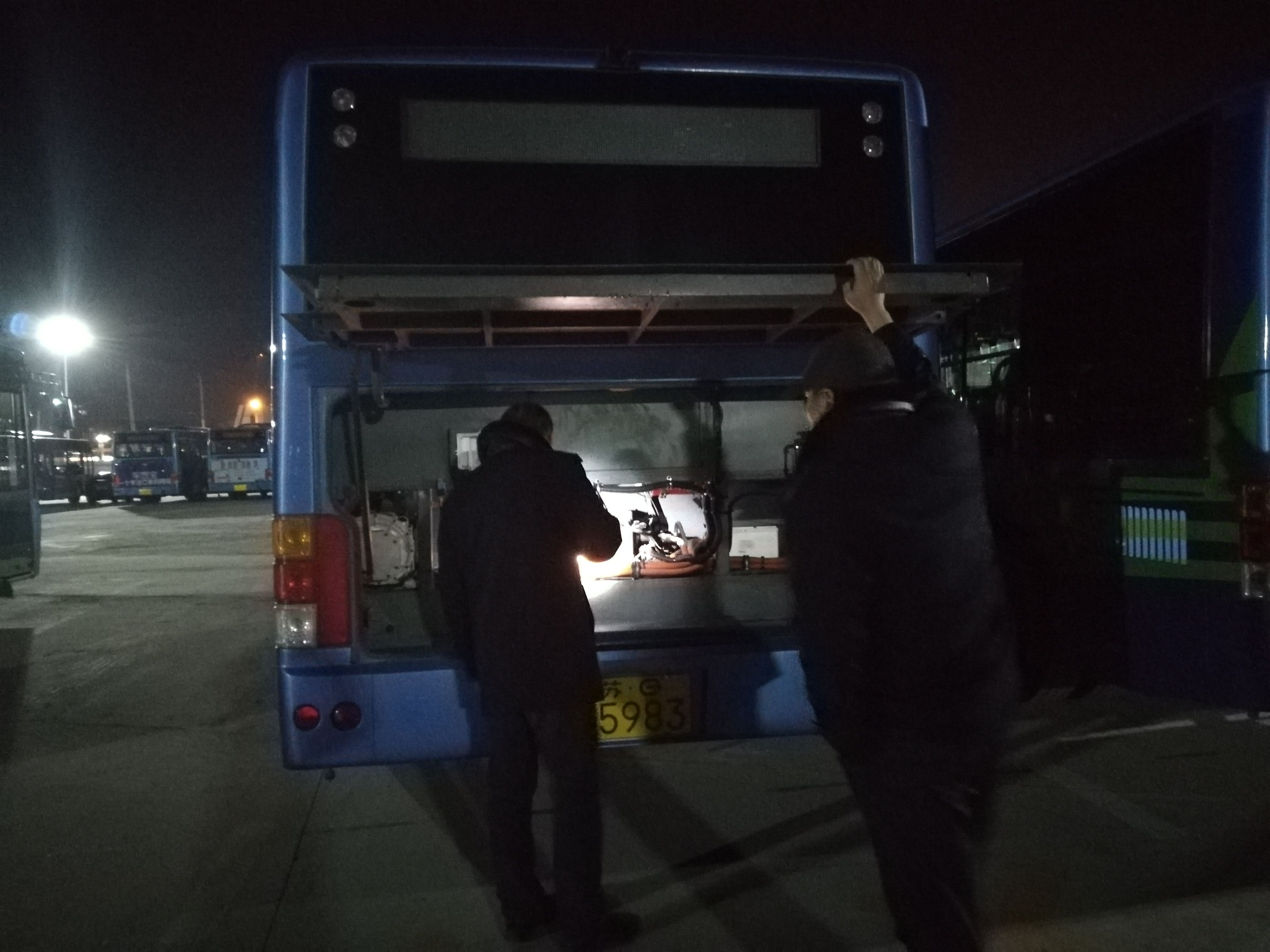 即使是寒冷的深夜,为确保车辆能够在第二天安全运营,安机人员顶着寒风一一检查,不放过每个细节