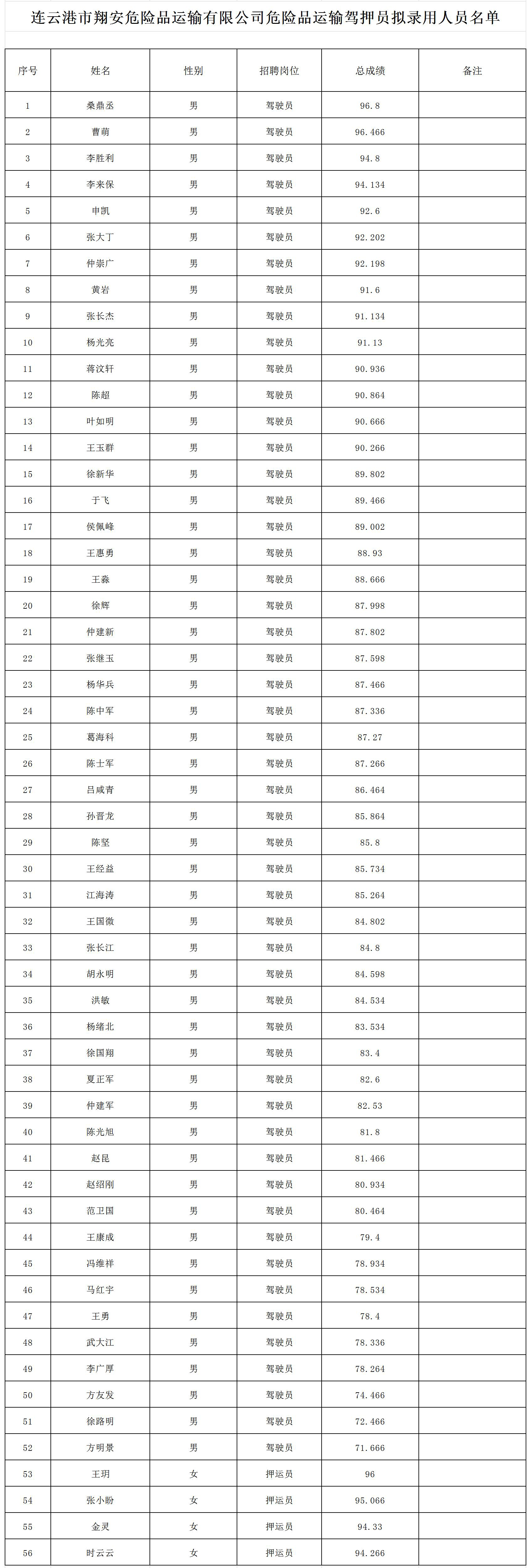 根据连云港市翔安危险品运输有限公司危险品运输驾押员招聘公告有关规定和要求,现将本次招聘拟录用人员名单予以公示。