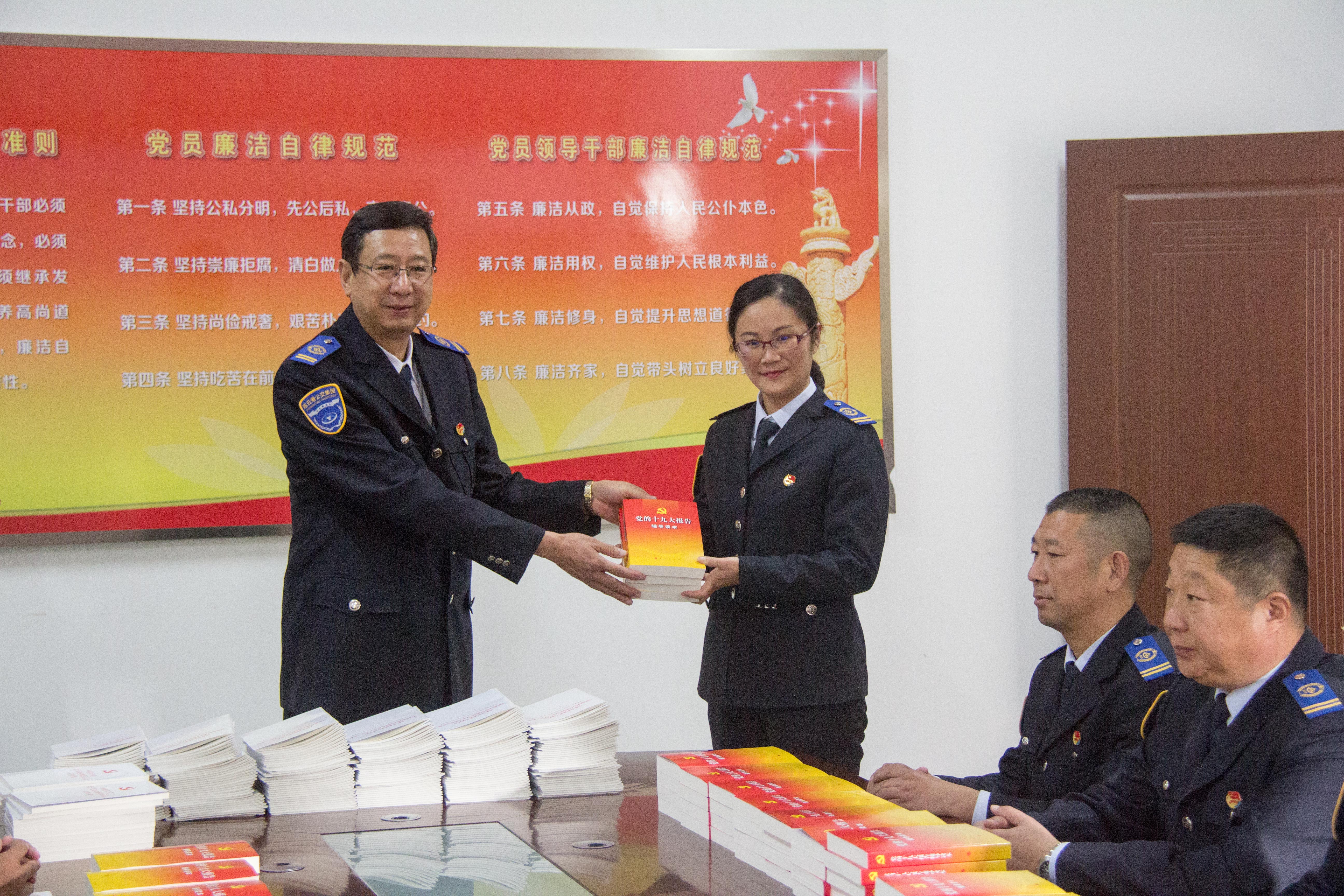 为扎实推动十九大精神在公交集团落地生根,党委决定在全集团范围内开展学习贯彻落实十九大精神系列活动:一是开展读原著活动。原原本本、反反复复读党的十九大报告,借助辅导读本认真学习领会十九大精髓,力求学深、学透。党委为每个党员配备了十九大文件和学习资料,人手一份习近平在中国共产党第十九次全国代表大会上的报告《决胜全面建成小康社会夺取新时代社会主义伟大胜利》、《中国共产党第十九次全国代表大会文件汇编》、《党的十九大报告辅导读本》;