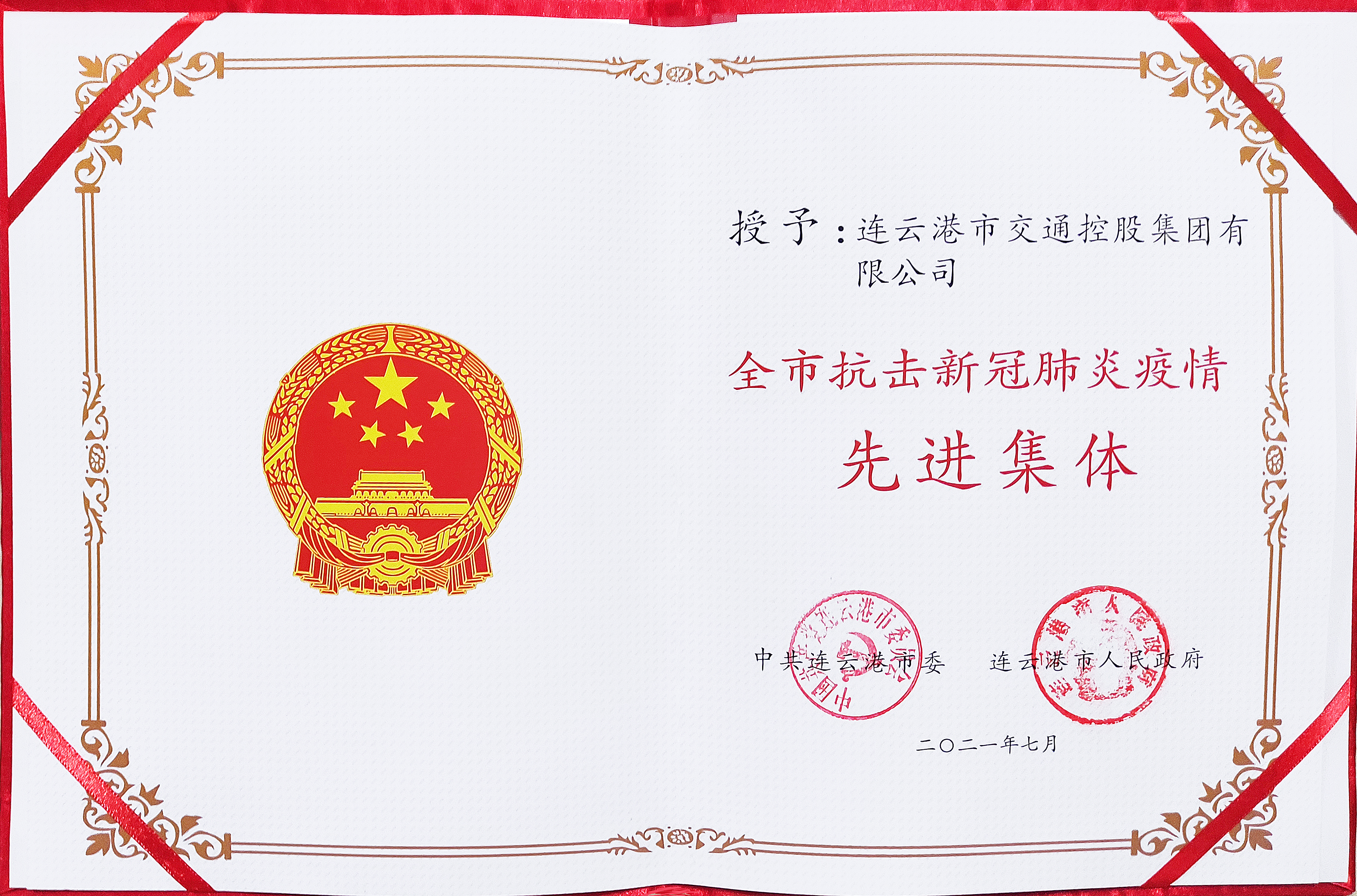 近日,集团被连云港市委、市政府授予“全市抗击新冠肺炎疫情先进集体”荣誉称号。