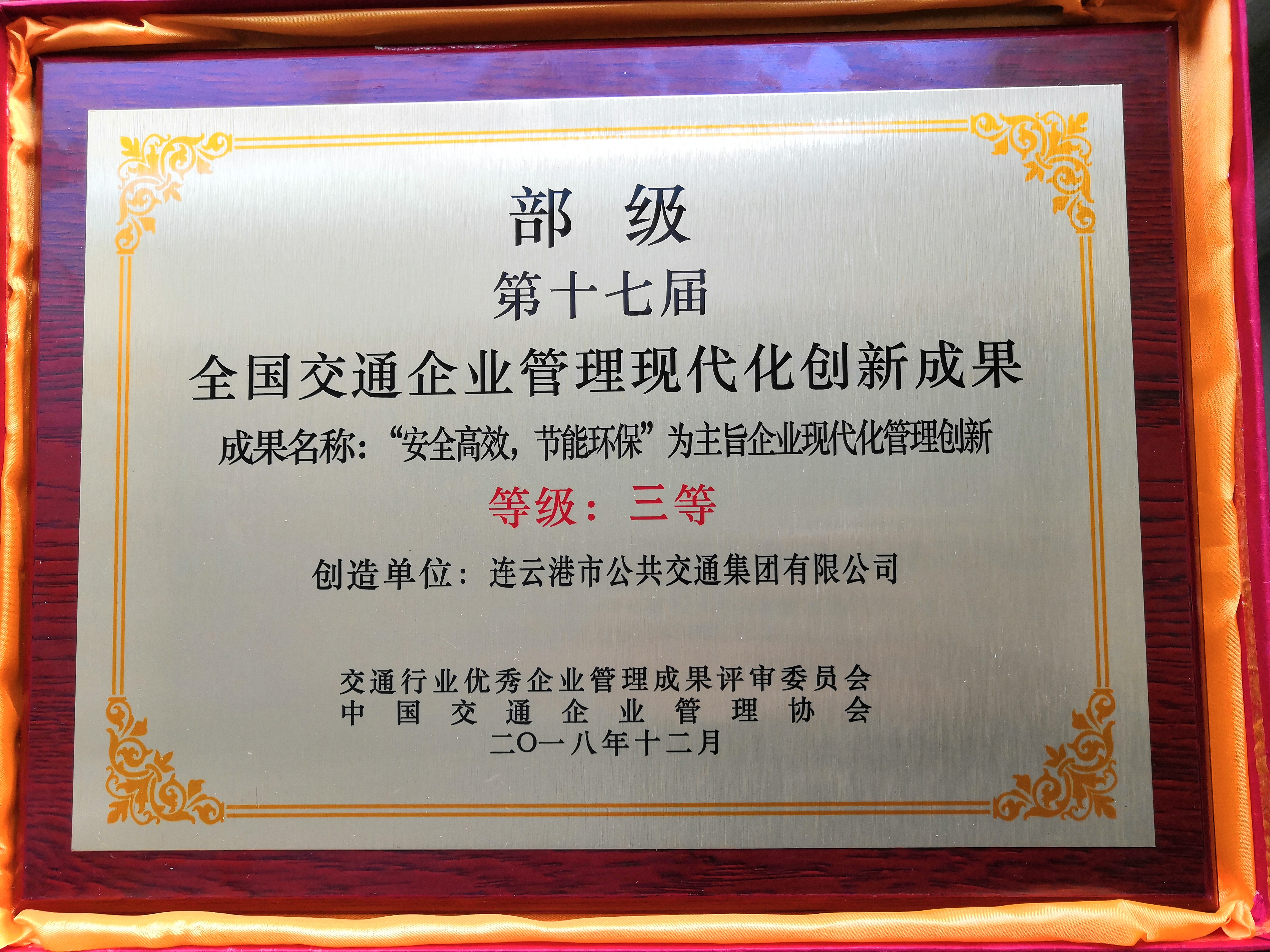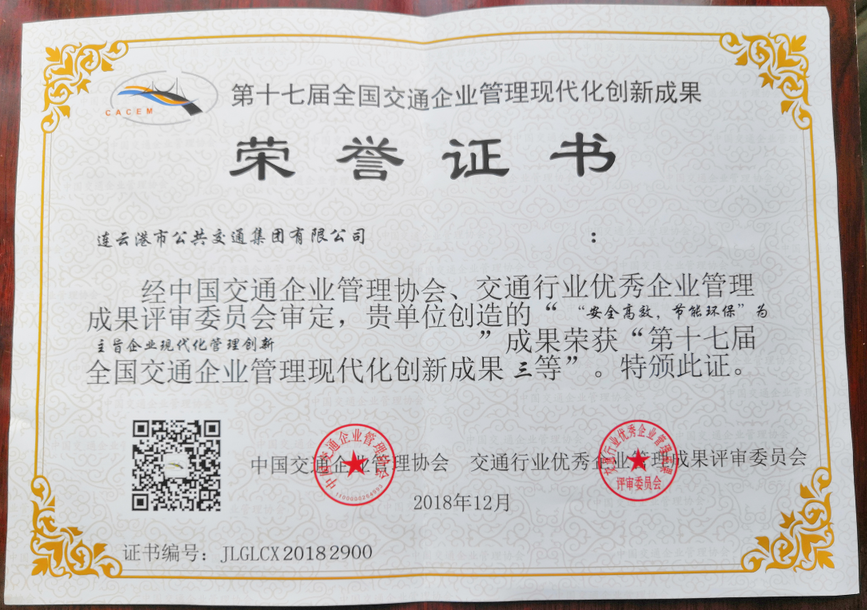 2019年第十七届全国交通企业管理创新年会3月15日在山东济南召开,大会以“新时代以管理创新促进企业高质量发展”为主题,发布了近年来全国交通企业管理现代化创新成果分析报告。连云港公交集团“以‘安全高效,节能环保’为主旨企业现代化管理创新”成果喜获第十七届全国交通企业管理现代化创新成果三等奖,是省内唯一获奖的公交企业。