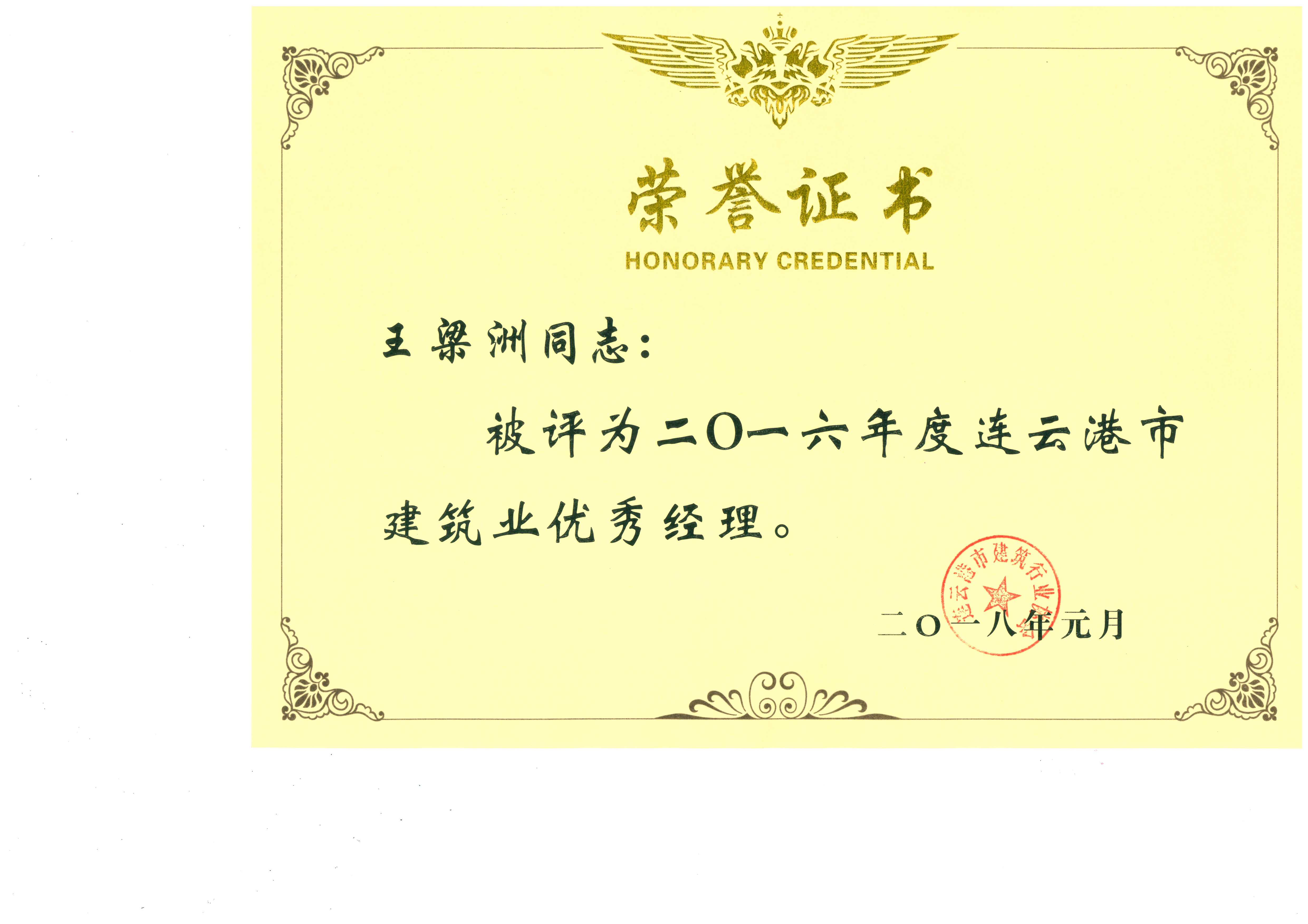 为表彰2016年度在建筑业改革和发展中做出突出贡献的企业和个人,近日,连云港市建筑业协会发文授予了江苏海通建设工程有限公司“2016年度连云港市建筑业优秀企业”荣誉称号,公司总经理王梁洲获得“2016年度连云港市建筑业优秀经理”称号,公司项目经理高涛、李法广、孙怀军分别获得“2016年度连云港市建筑业优秀项目经理”称号。