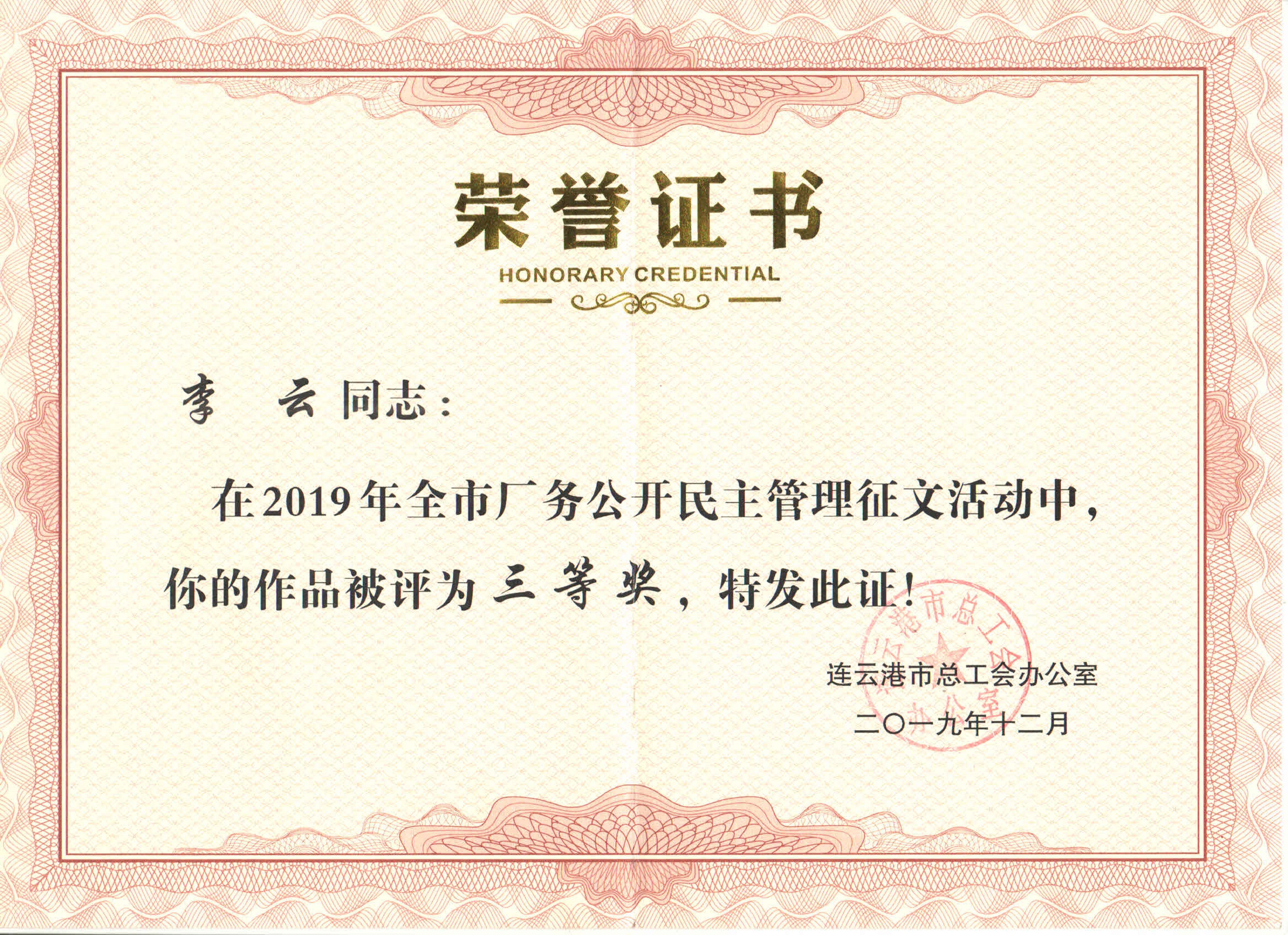 2020年6月4日,连汽修理公司李云荣获由连云港市总工会颁发的2019年全市厂务公开民主管理征文活动“三等奖”。
