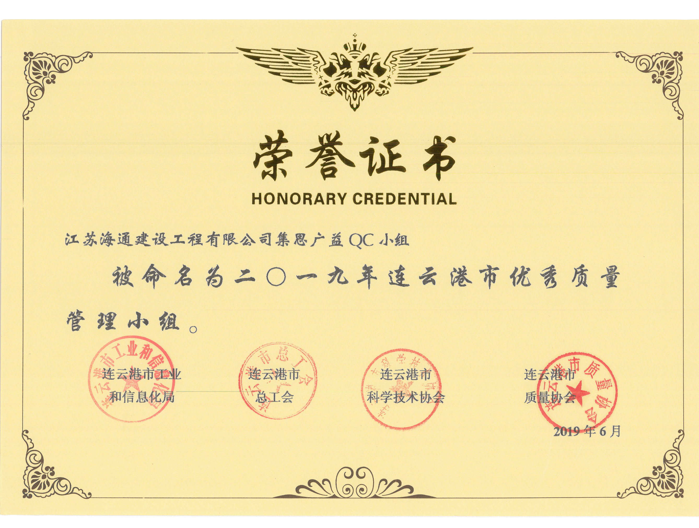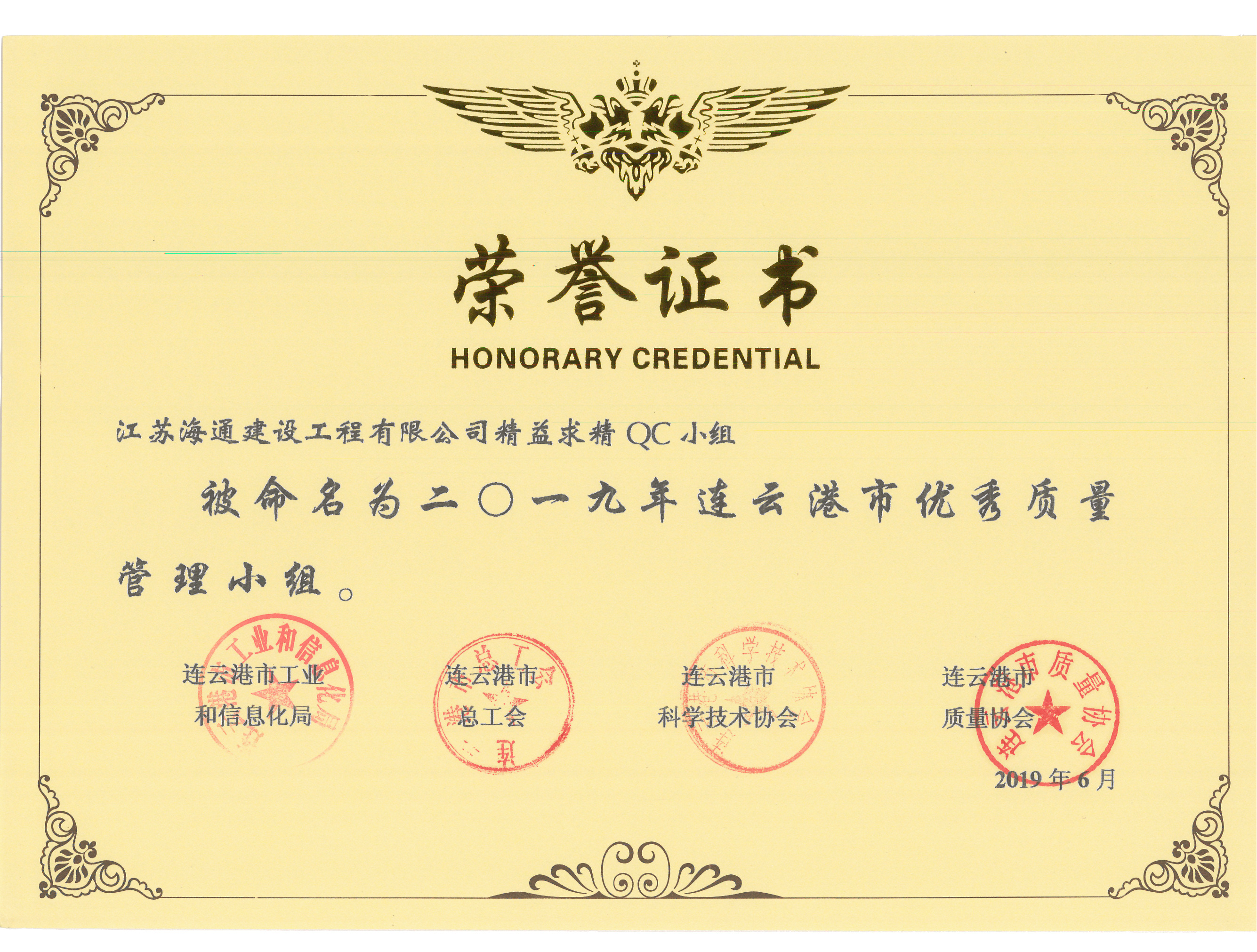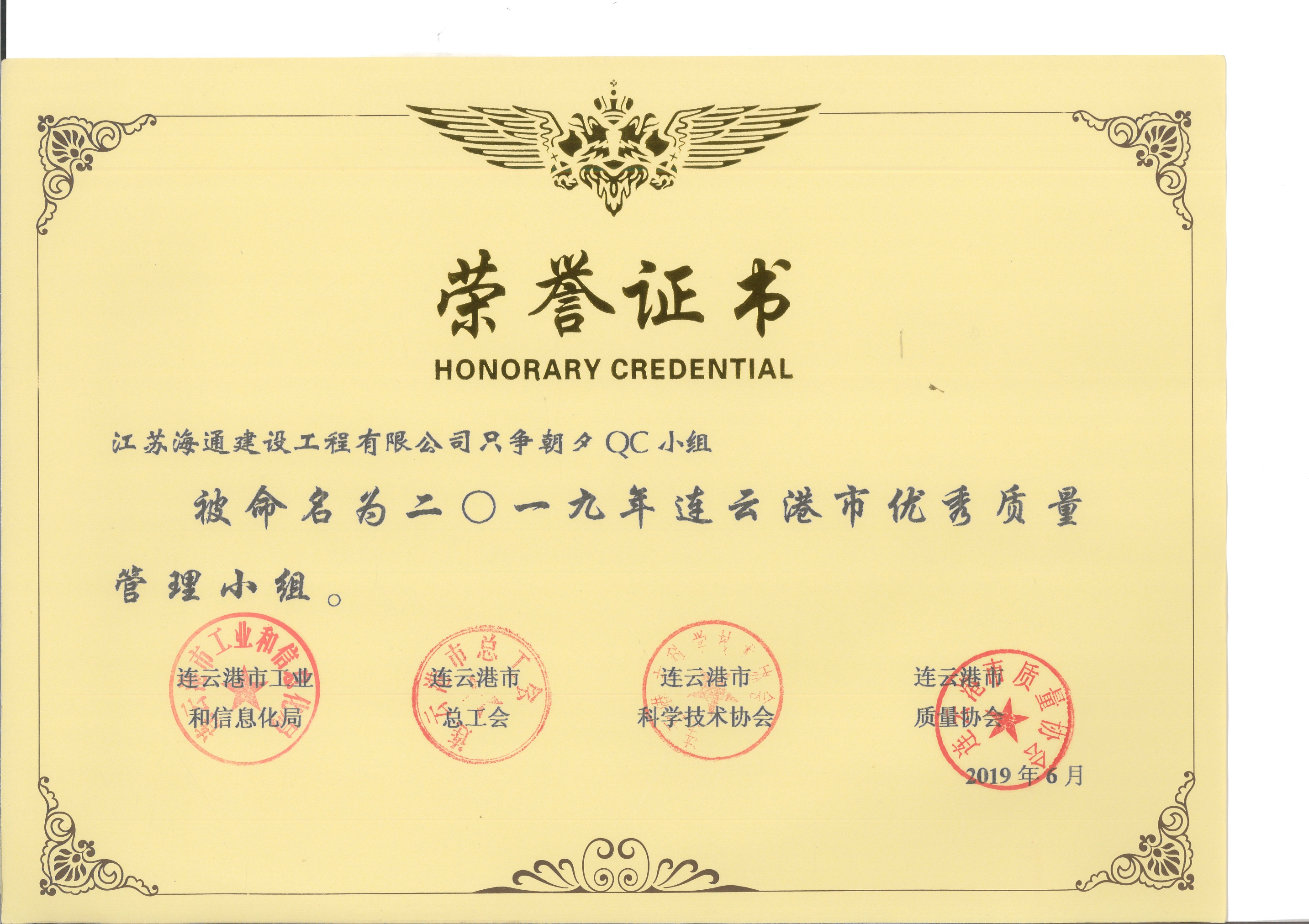 经过市工信局、总工会、科协、质量协会联合专家评审组的评审,江苏海建公司三个QC小组获得2019年连云港市优秀质量管理小组,获奖的小组分别为:只争朝夕QC小组、集思广益QC小组、精益求精QC小组。