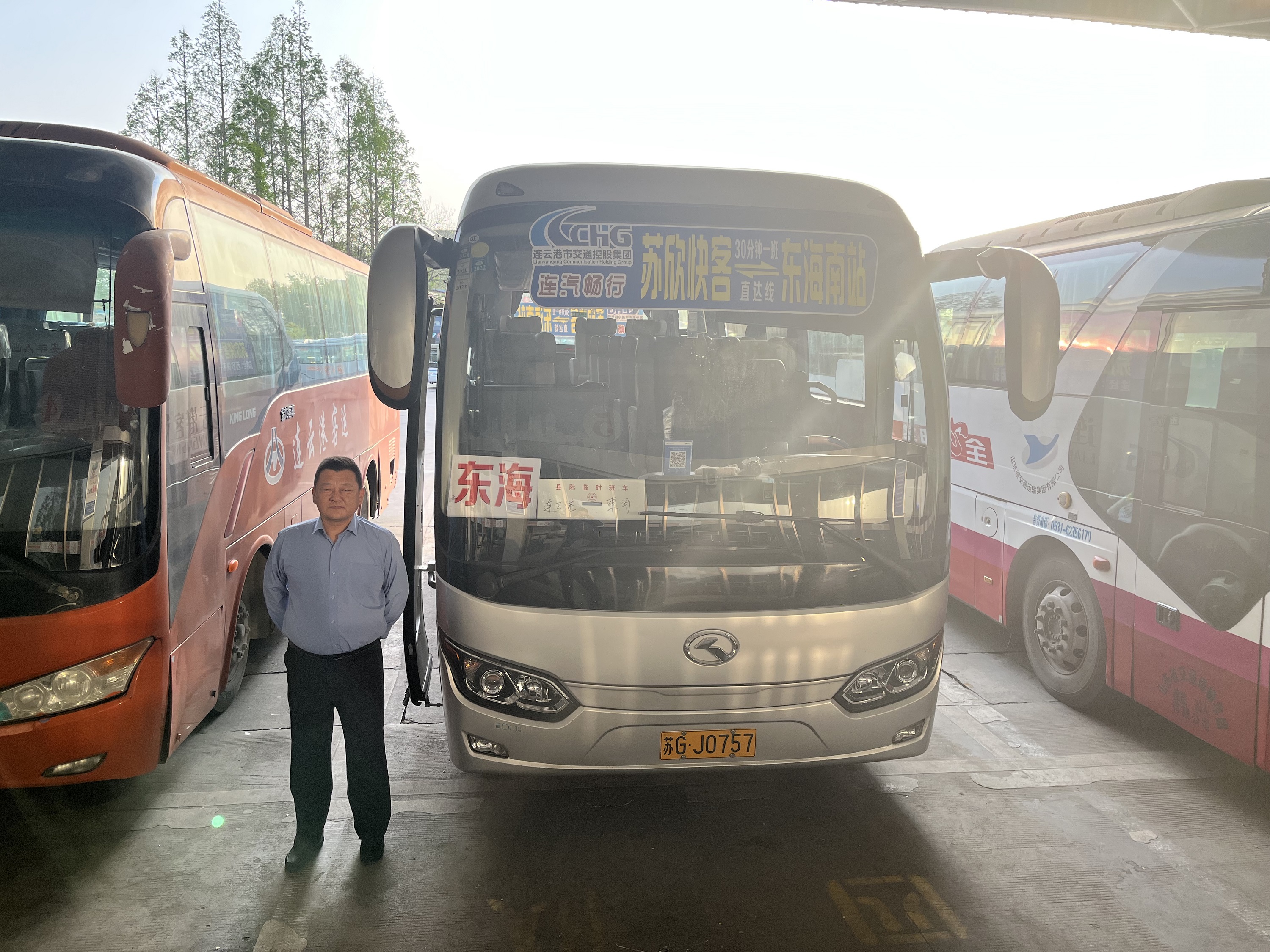 发车区内,“东海快捷线”车身焕然一新,统一标识,驾驶员统一着装,上午六点三十分,苏欣快客站发出第一班市区至东海快捷专线。