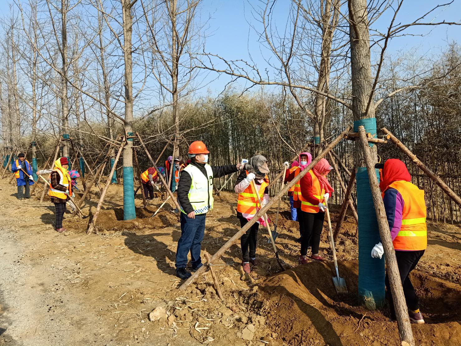 按照疫情防控有关要求,项目对所有进场施工人员及现场管理人员进行了健康码审查及体温测量,切实保障安全复工。绿化施工方面,对老副坝两侧播撒混播草籽,开展春季绿化苗木采购工作,安排60多名工人对已种植苗木进行修剪,对银杏树进行加固,并安排2辆洒水车对道路两侧露肩的苗木洒水养护。道路施工方面,现场6台挖机、12辆运土机正忙碌地运作,进行土方路基回填施工。