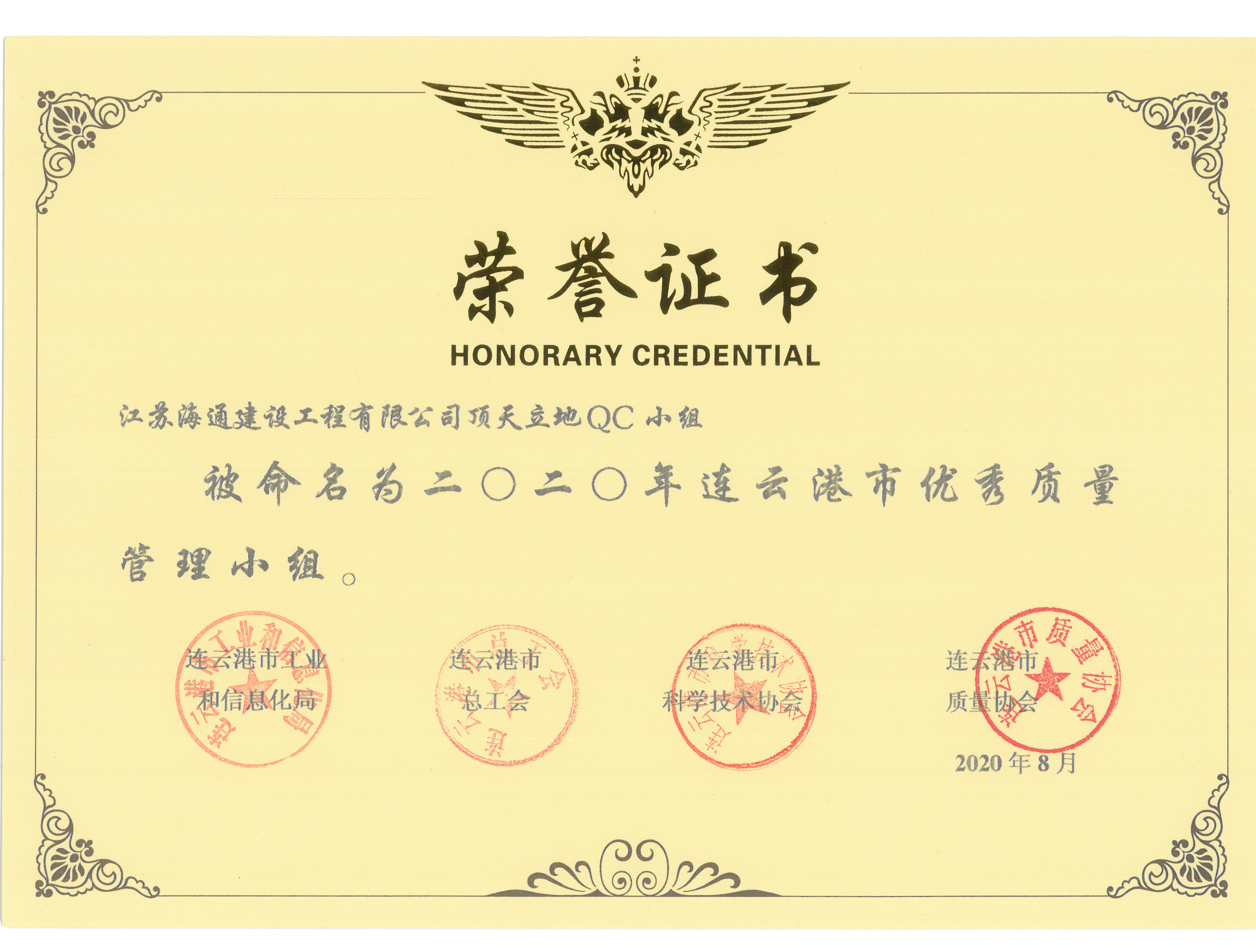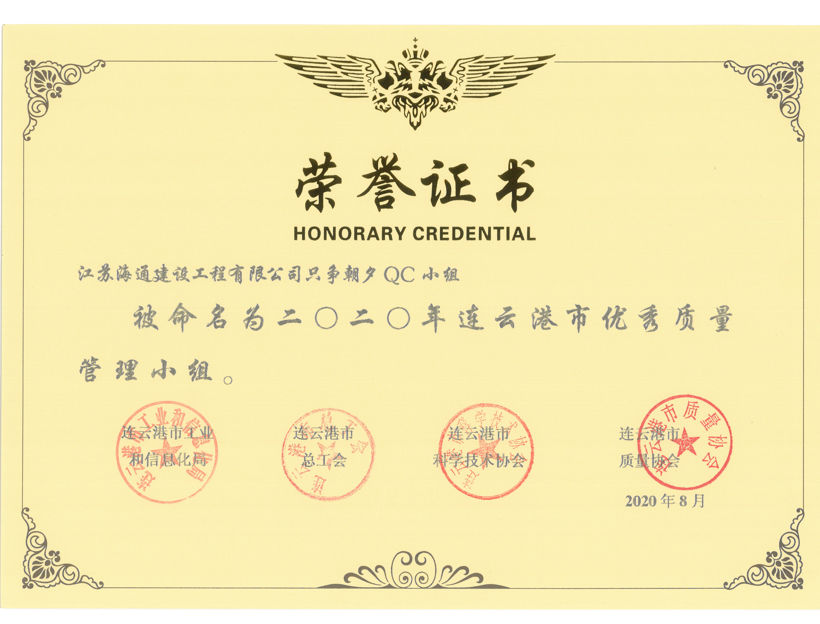 近日,市工信局、总工会、科协、质量协会联合下发了文件《关于表彰2020年连云港市优秀质量小组、质量信得过班组、优秀企业、卓越领导者、优秀推进者的通知(连工信发[2020]199号)》并颁发了荣誉证书,海建公司顶天立地QC小组和只争朝夕QC小组荣获2020年连云港市优秀质量管理小组。