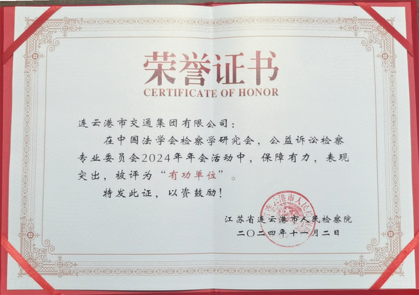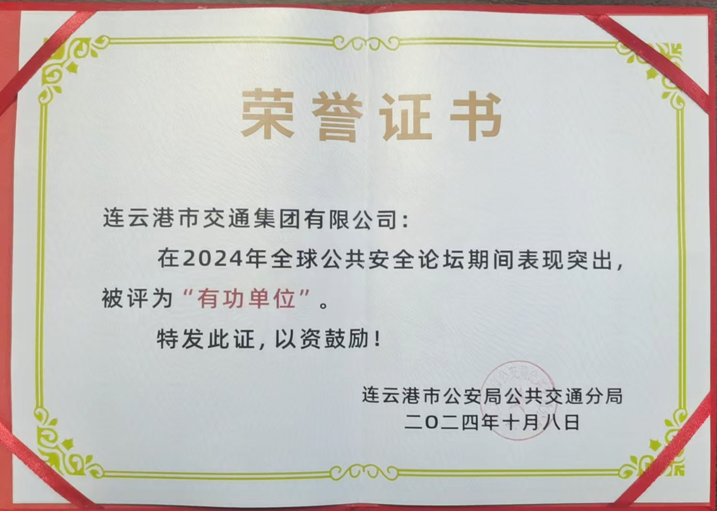 交通集团凭借卓越的服务质量和高度的社会责任感,荣获了由市人民检察院、市公安局公共交通分局、连云港火车站站前广场管理服务工作领导小组办公室颁发的荣誉证书,以及市发展和改革委员会赠送的锦旗。