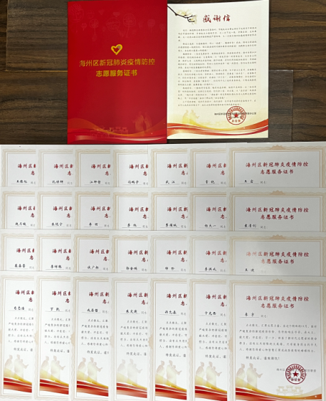 近日,物流集团28名志愿者收到来自海州区新冠肺炎疫情联防联控指挥部办公室、幸福社区送来的志愿服务证书,对物流集团给予疫情防控志愿服务工作表示衷心感谢。