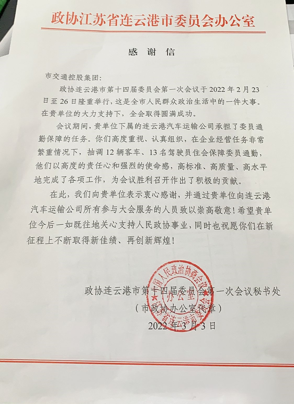 近日,从市交通控股集团获悉,政协连云港市第十四届委员会第一次会议秘书处发来感谢信,对汽车公司在第十四届委员会第一次会议中的交通保障工作表示衷心感谢,对公司所有参与大会服务的人员致以崇高的敬意。