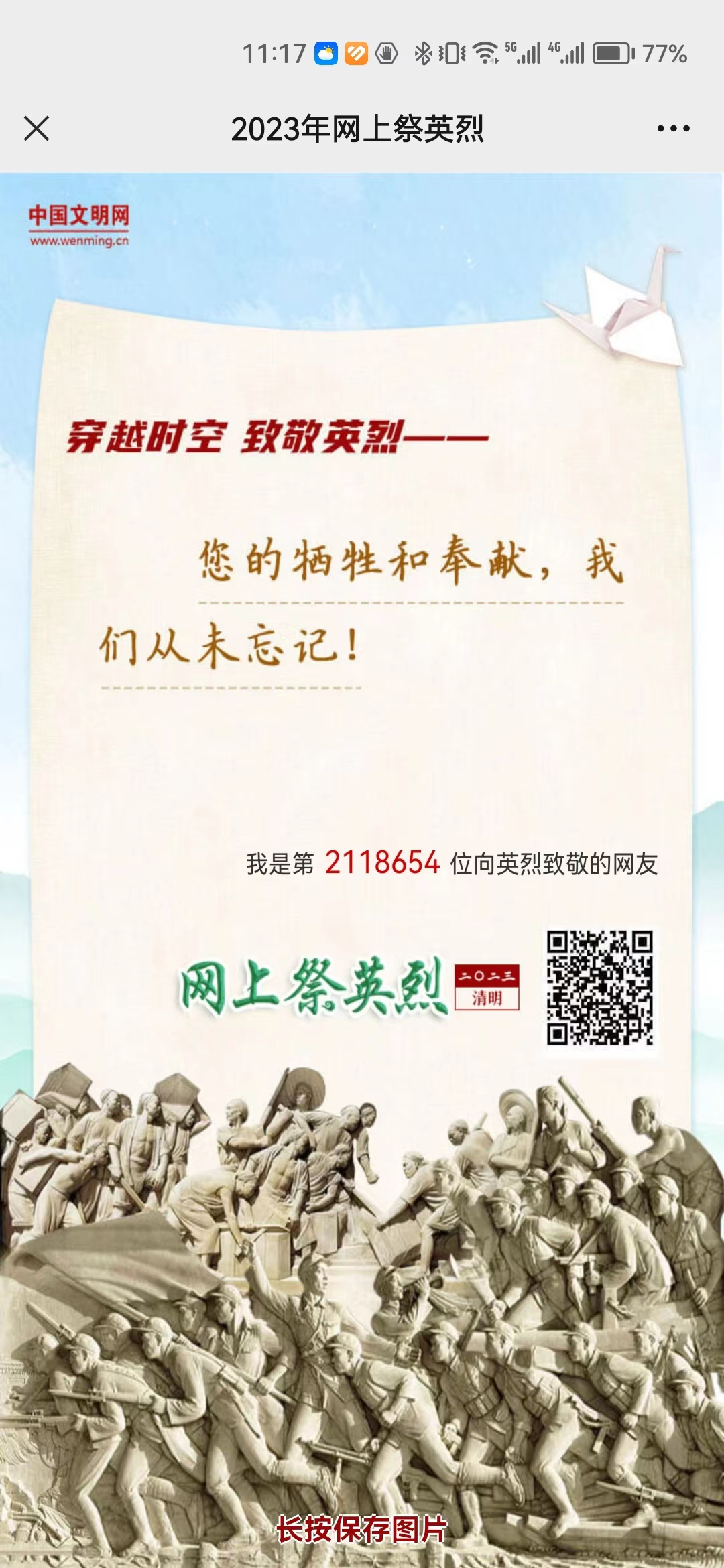 活动中,全体党员干部同志用个人手机登陆“中华英烈网”、“中国文明网”平台开展网络“云”祭扫,通过网上浏览英烈事迹、观看视频展播、敬献花篮、发表追思寄语等方式,用文明健康、节俭环保的形式,深切表达对革命先烈的崇高敬意与追思之情。