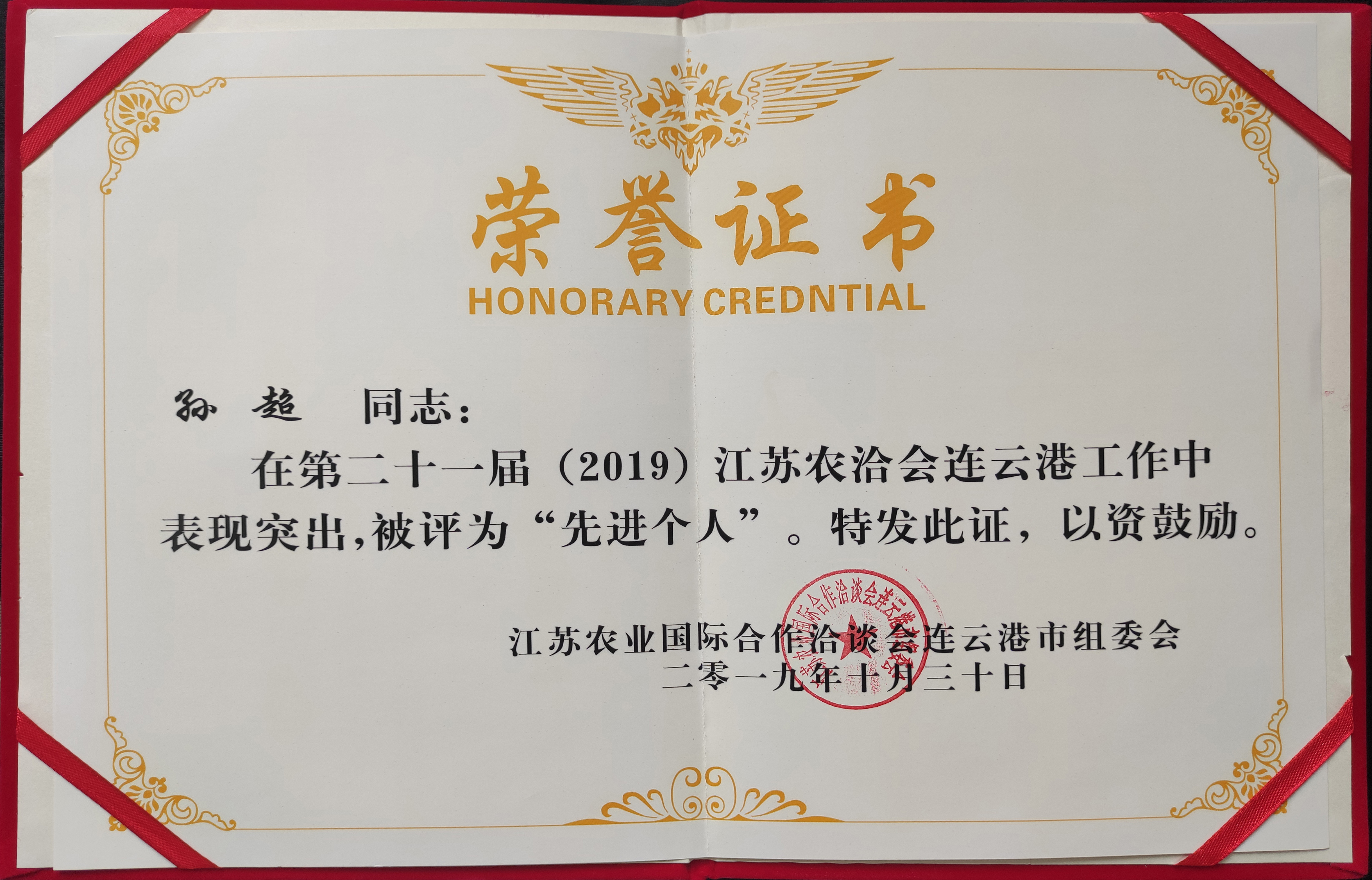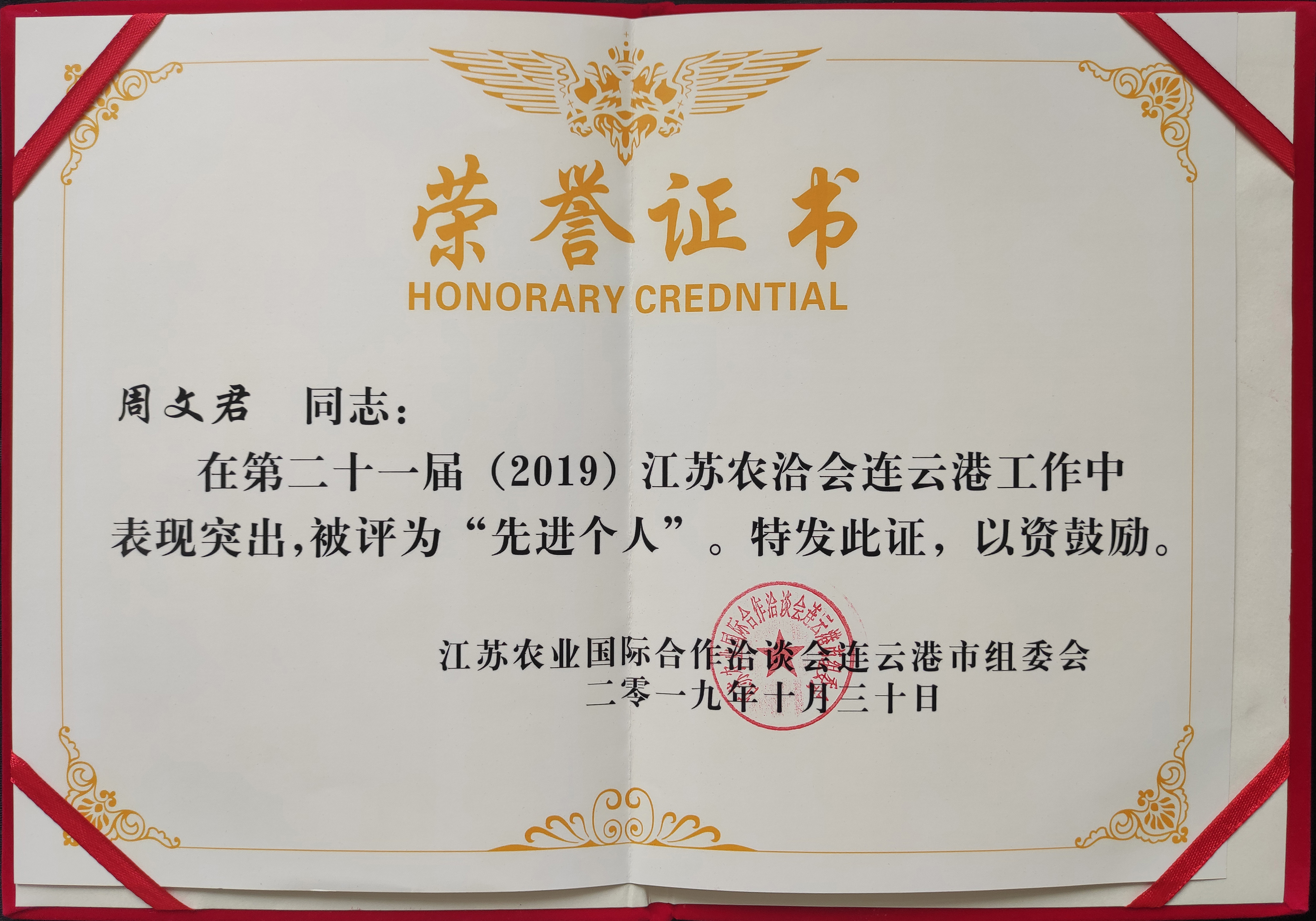 0月30日,从江苏农业国际合作洽谈会连云港市组委会获悉,集团被评为第二十一届(2019)江苏农业国际合作洽谈会先进集体。孙超、周文君被评为先进个人。