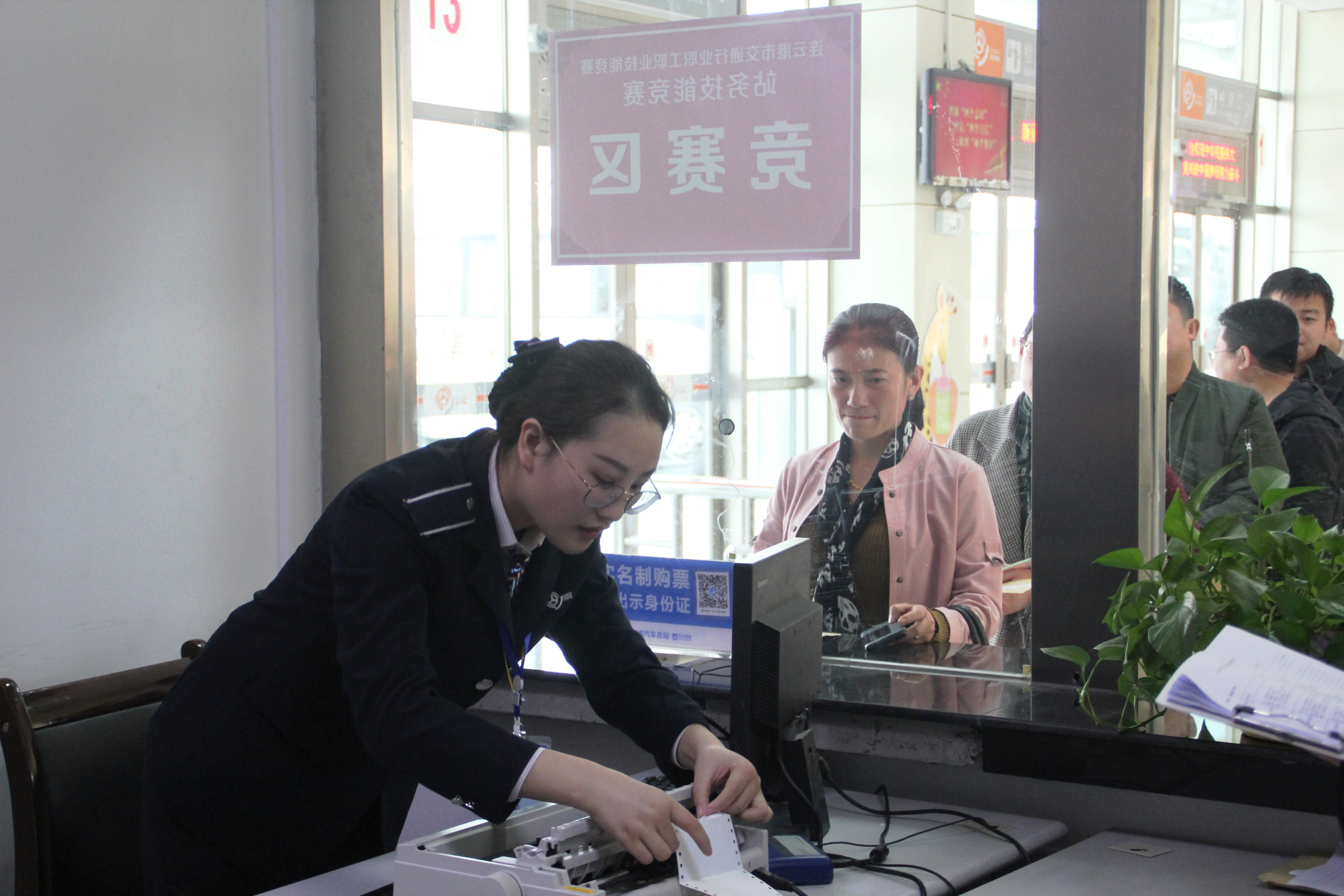 本次比赛分三个项目:站务技能理论考、售票考试、检票考试。比赛现场选手们端庄的仪表、专业的知识、响亮的哨声、亲切的安全喊话,不时获得评委和同事们的称赞。经过一天的激烈角逐,来自新浦总站的孙书语、李园园、曹姗姗分别获得一、二、三等奖。