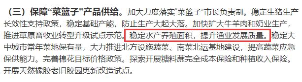 在全力抓好粮食生产和重要农产品供给部分,文件提出:稳定水产养殖面积,提升渔业发展质量。