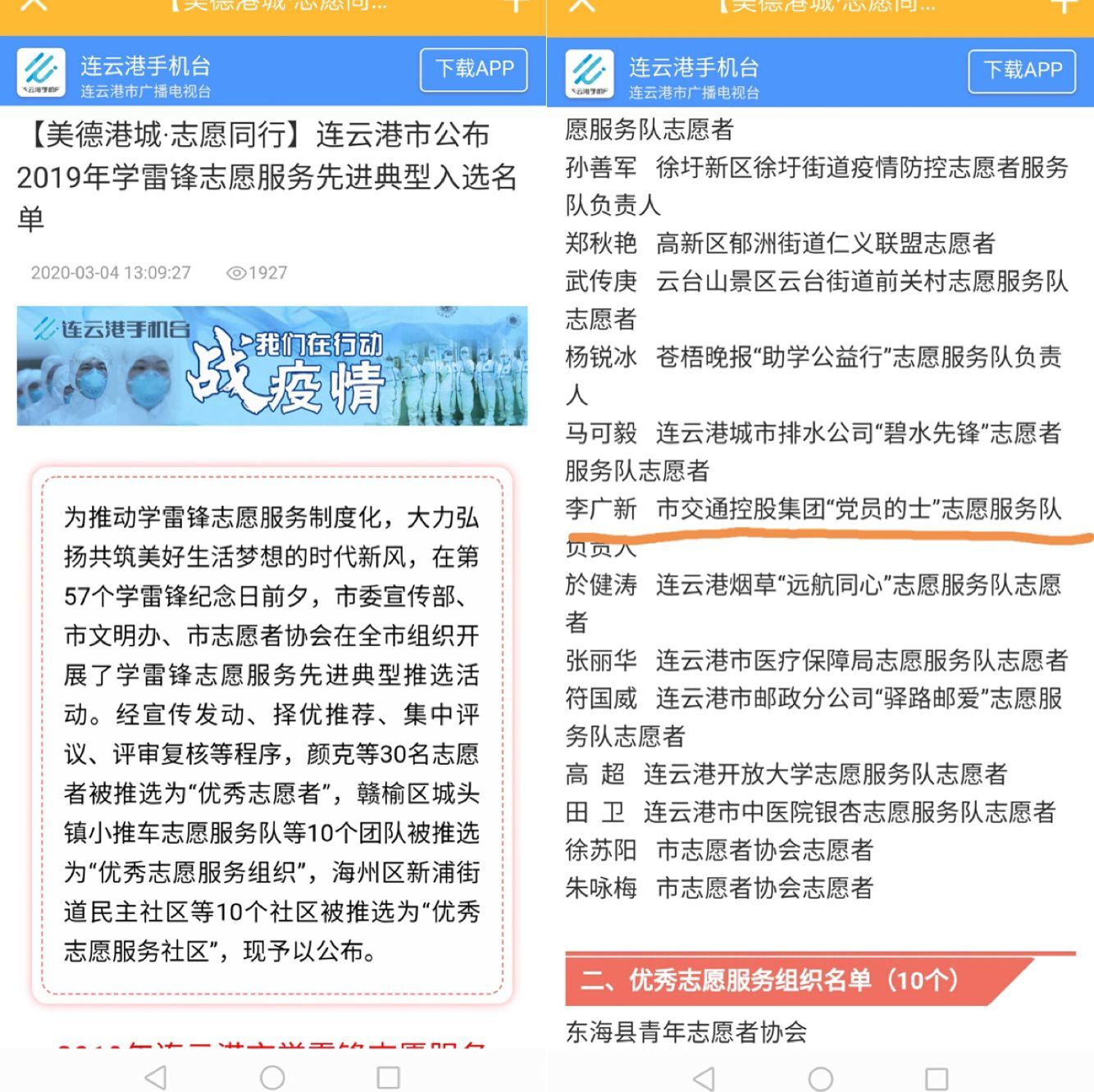 3月4日,从连云港手机台喜获消息,由市委宣传部、市文明办、市志愿者协会在全市组织开展的学雷锋志愿服务先进典型推选活动中,汽服出租汽车事业部经理李广新当选2019年连云港市学雷锋志愿服务“优秀志愿者”。