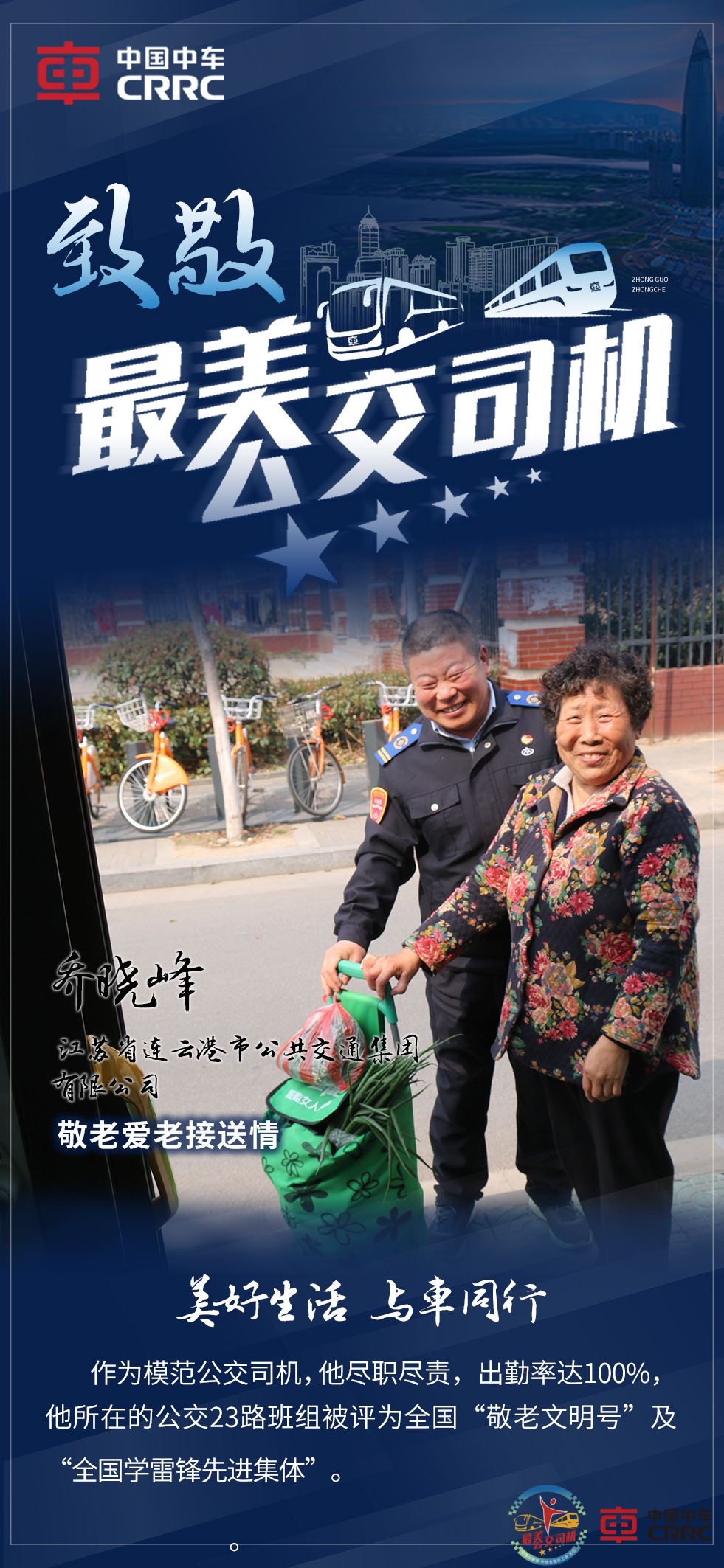 乔晓峰是集团权属企业连云港市公共交通集团有限公司23路“敬老文明号”线路班长。作为驾龄长达34年的模范公交司机,他每日提前到岗半小时,做好“一日三检”工作,确保车辆部件安全有效。他在车厢内增设符合老年人使用习惯的“爱心按铃”,有效解决了老年乘客下车难、下车慢问题。在工作中,他尽职尽责,无一起投诉和行车事故发生。他所在的公交23路班组被评为全国“敬老文明号”及“全国学雷锋先进集体”。