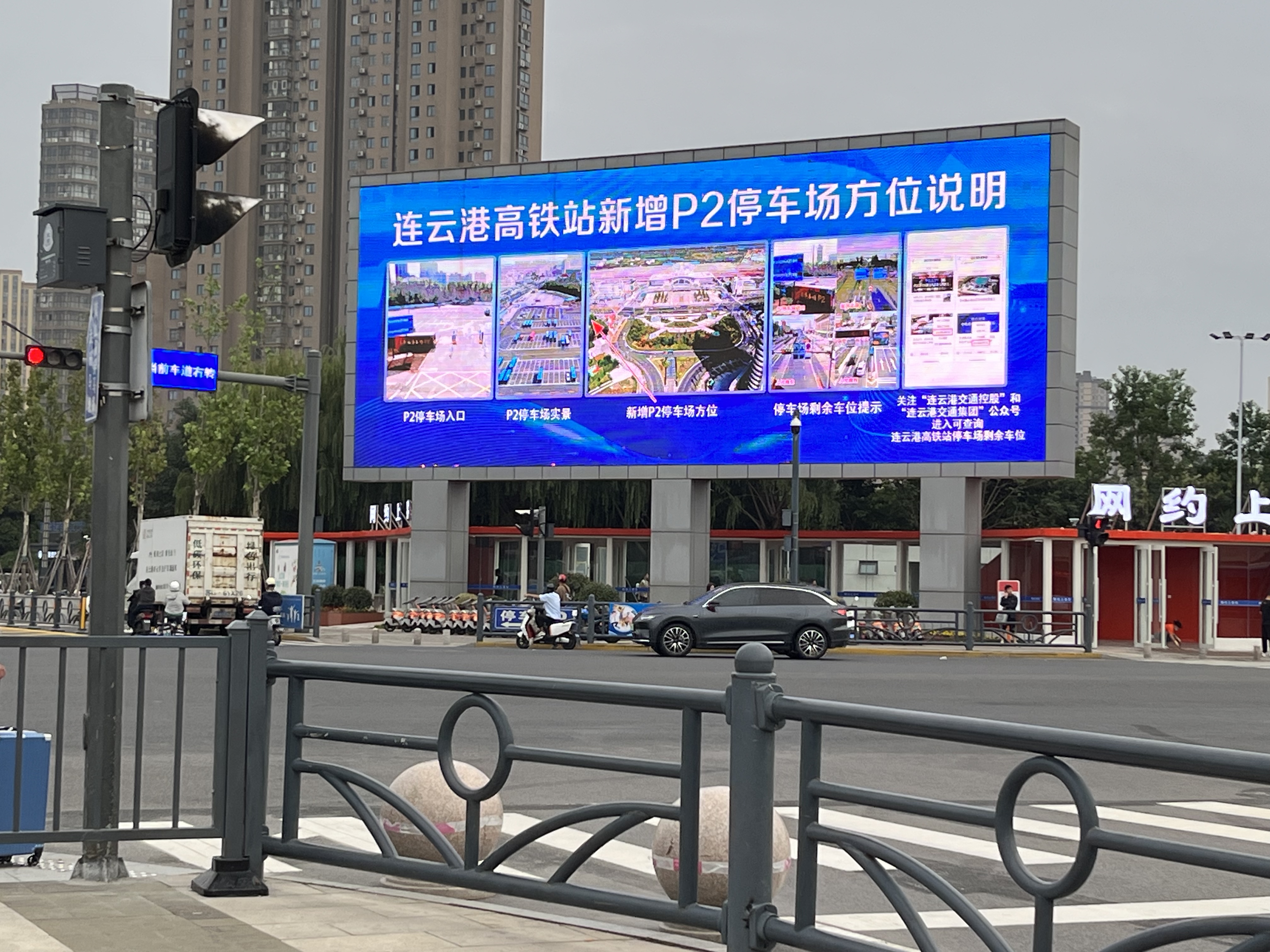 连云港火车站P1,共设停车位772个,其中含无障碍车位18个,充电车位18个,出租车位60个。为保障节日期间社会车辆的容纳空间,并为广大市民和外来旅客提供停车便利,交通集团新设火车站停车场P2,位于连云港站西侧400米处,紧邻人民路隧道,设置400个停车位,特殊应急情况可容纳500辆社会车辆;与此同时,集团充分利用自身媒体宣传资源,在南广场LED大屏刊放了“连云港高铁站新增P2停车场方位说明”指示图。