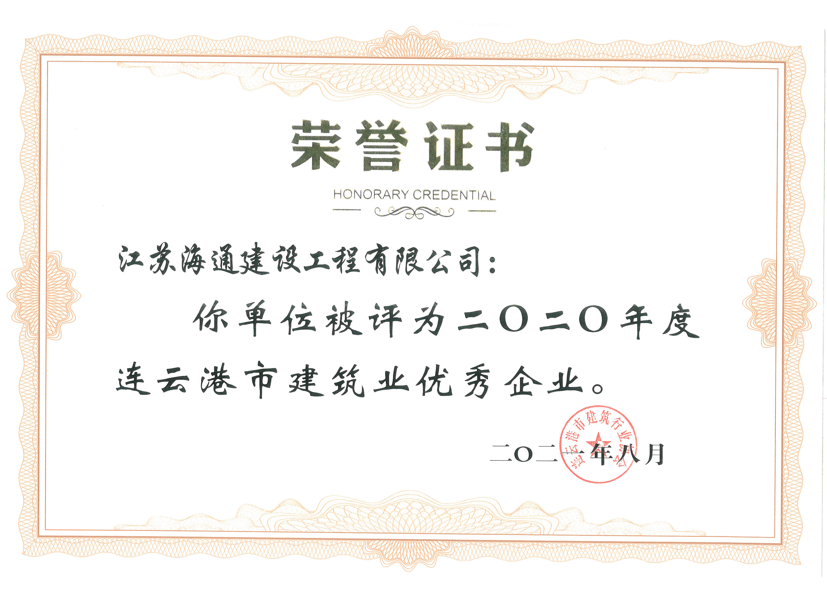 日前,从连云港市建筑行业协会获悉,江苏海建公司获评“2020年度连云港市建筑业优秀企业”,这也是江苏海建公司第12次获得该奖项。