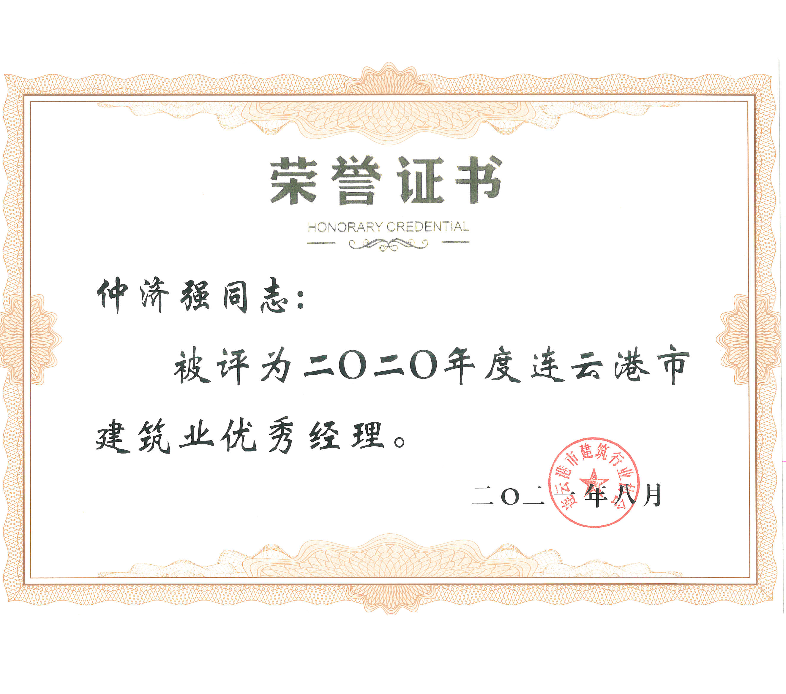 此外,公司董事长、党委书记仲济强被评为“2020年度连云港市建筑业优秀经理”,刘智、杨城、徐进、王建成被评为“2020年度连云港市建筑业优秀项目经理”。