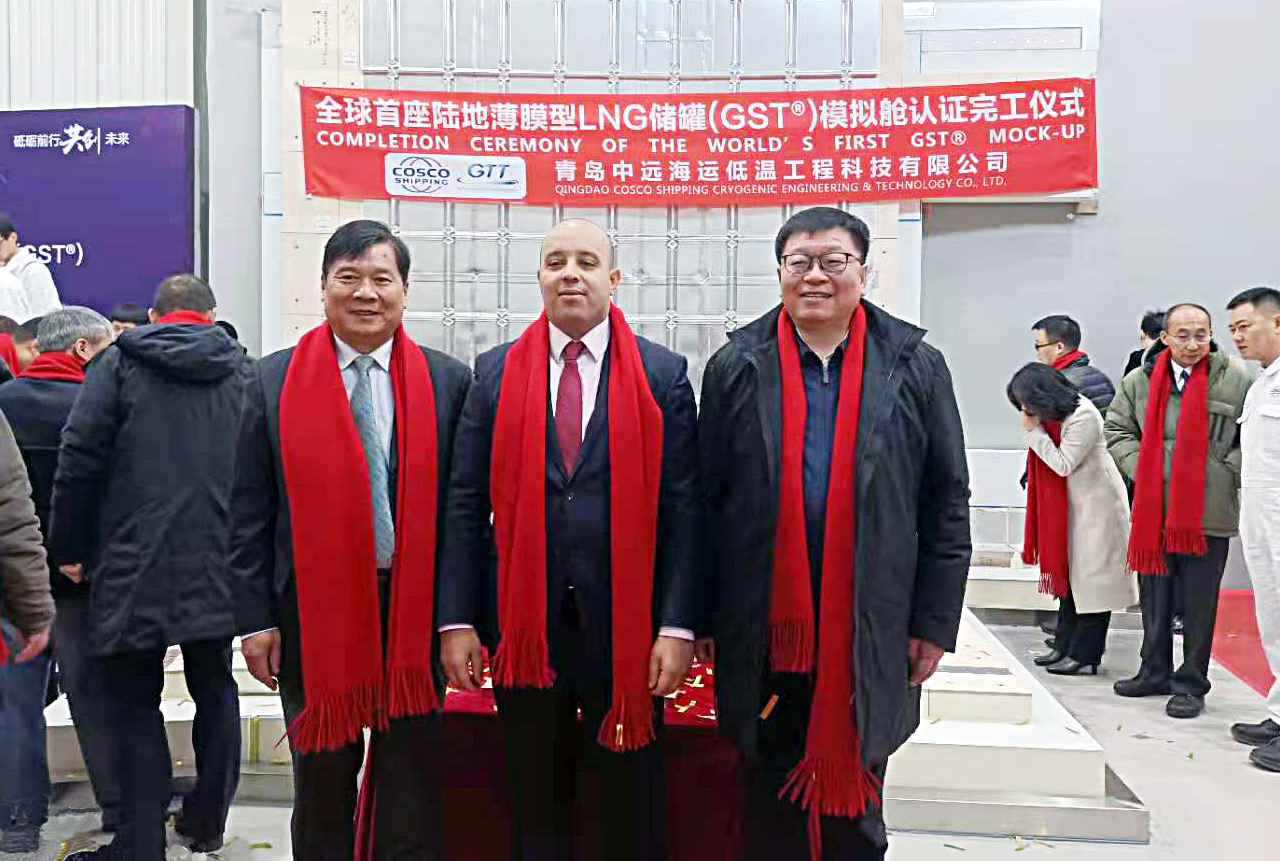 12月21日上午,青岛中远海运低温工程科技有限公司搭建的全球首座陆地薄膜型LNG储罐(GST®)模拟舱认证完工仪式在青岛举行。连云港市交通控股集团董事长、党委书记刘永能,中远海运青岛有限公司党委书记、董事长、总经理潘立东及GTT中国总经理安南出席仪式。