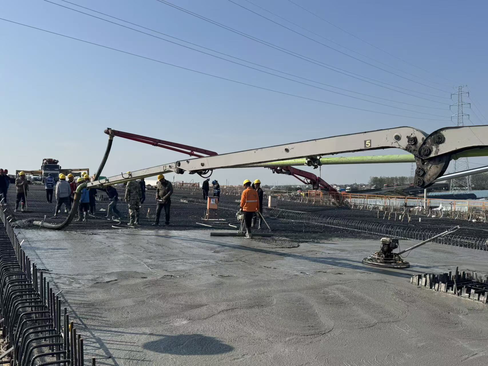 浇筑现场,一派热火朝天。泵车舒展长臂,精准将混凝土输送至箱梁顶端;施工人员各司其职、协同工作,振捣、平整、收面等各工序衔接紧密、精准有序;工程技术员全程跟踪监测,实时把控浇筑节奏与质量,确保浇筑质量万无一失。为保障这一关键节点顺利突破,项目部提前一周召开专项技术交底会,结合现场实际反复优化施工方案,对模板加固、钢筋绑扎等前置工序进行多轮检查验收,层层压实质量管控责任。连续十余小时的浇筑作业,既是对施工组织的考验,更是对团队协作的锤炼。