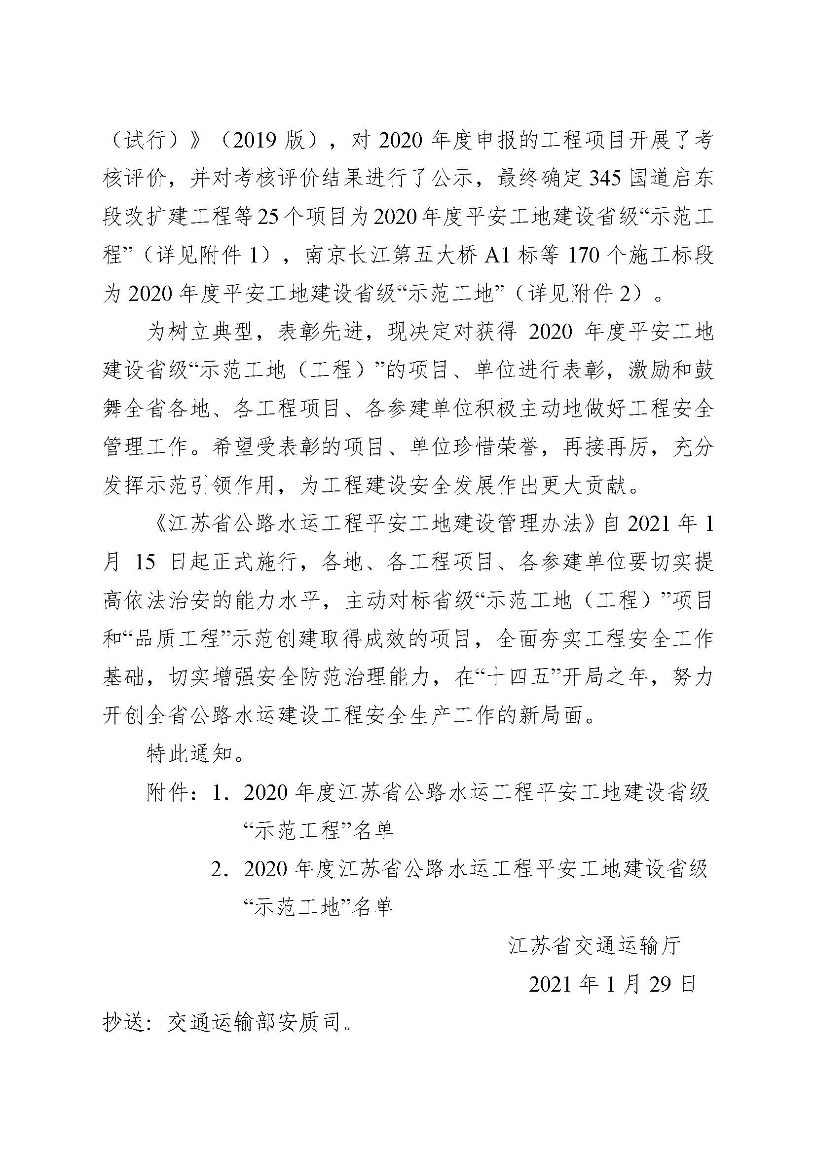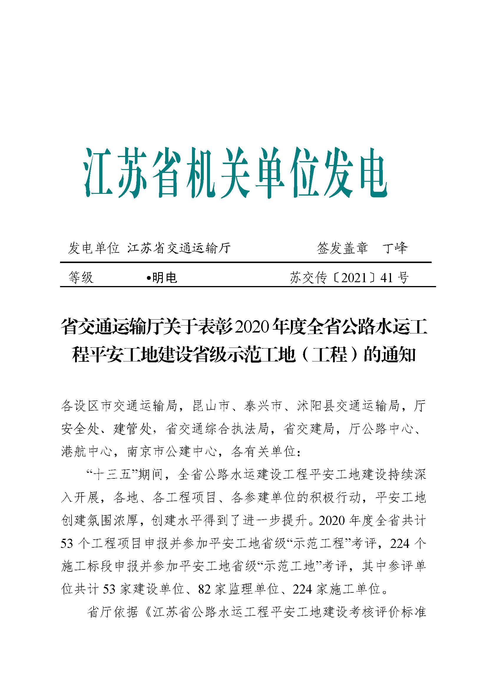 近日,从江苏省交通运输厅处获讯,由江苏海建港通分公司承建的337省道灌南段路面改造工程荣获省级示范“平安工地”称号。