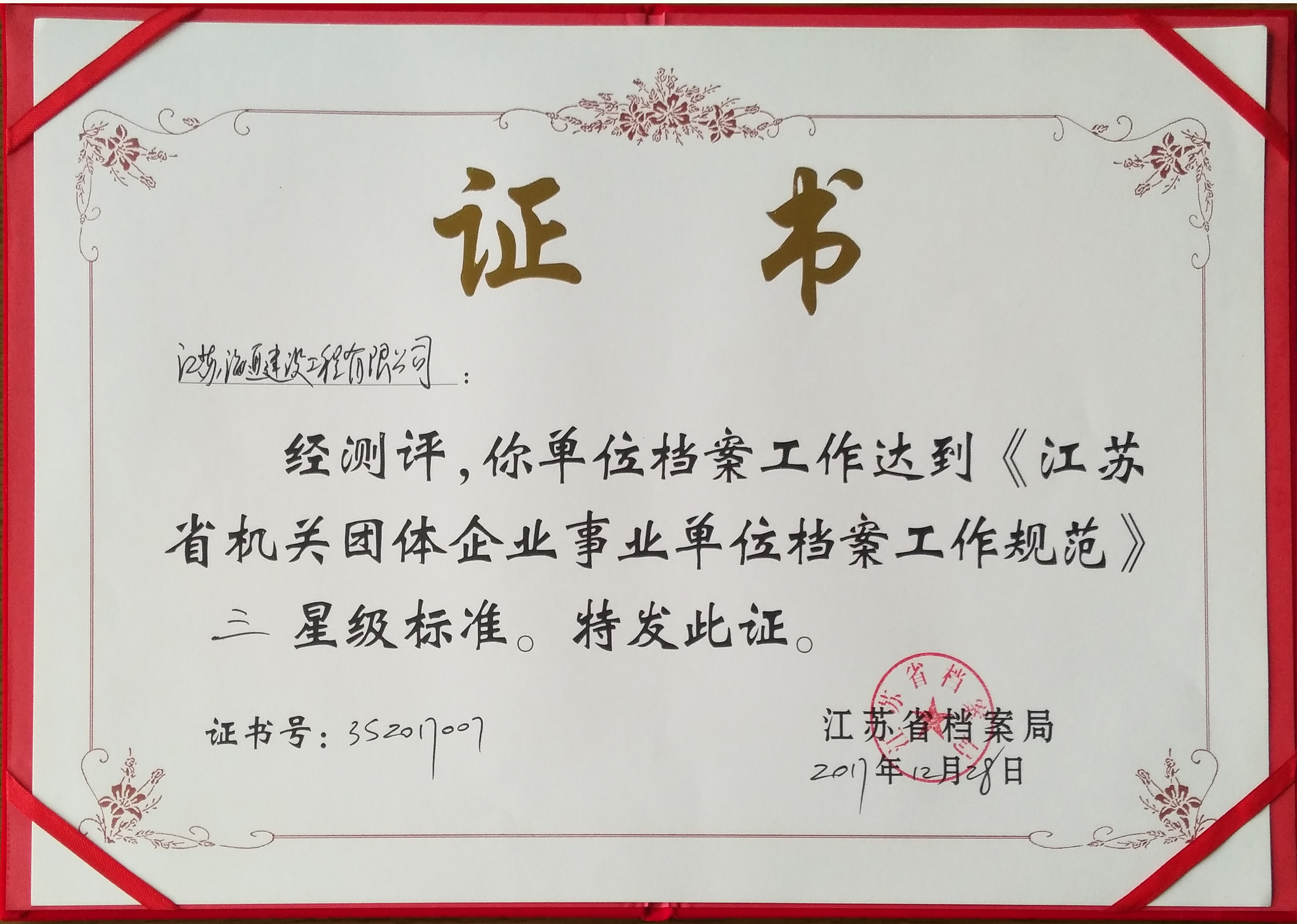 22日,江苏海建公司喜获由江苏省档案局颁发的“江苏省档案工作三星级”奖牌和证书。