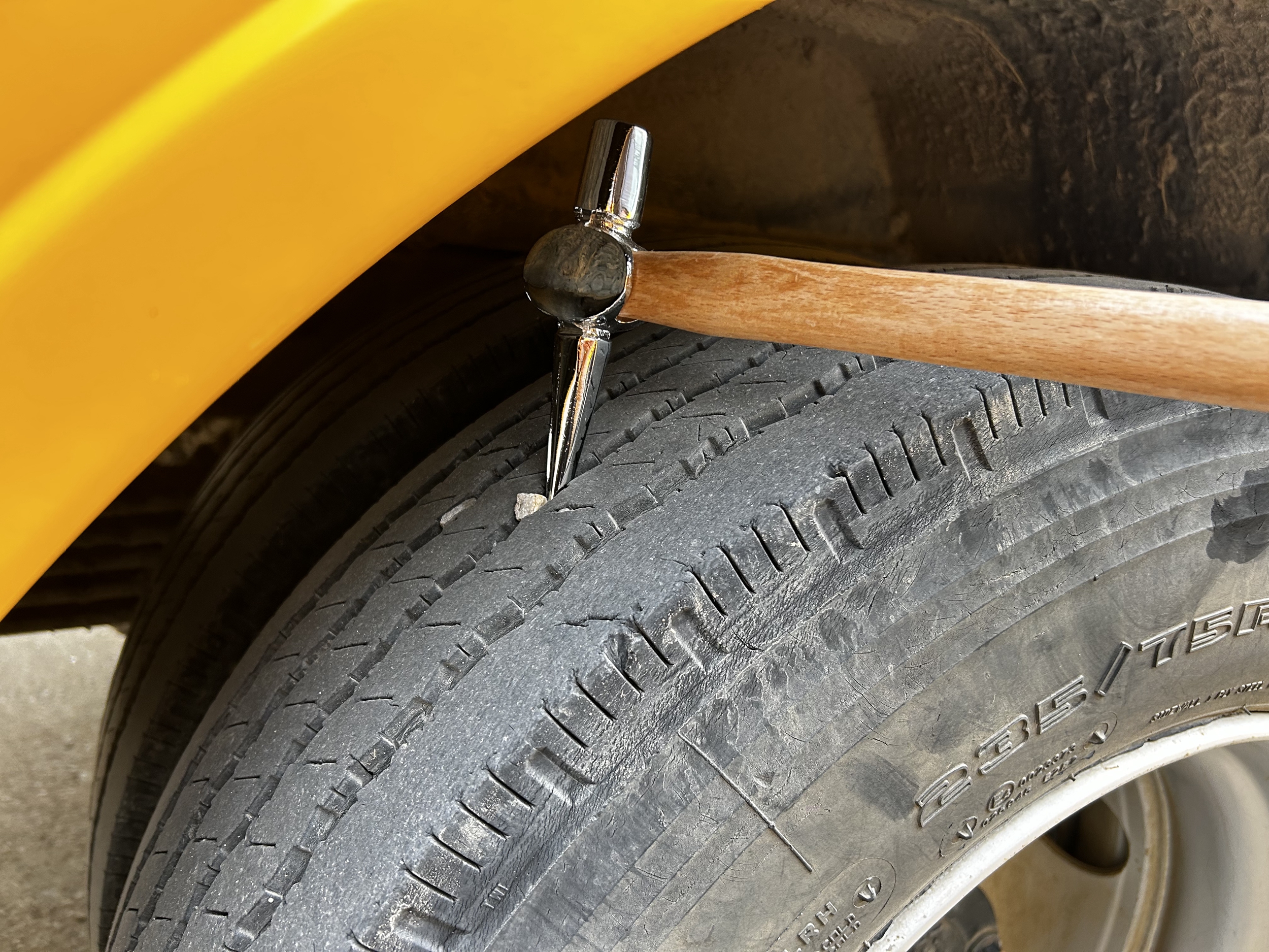 校车上自带的锤子是平头的,只能敲敲打打,对于缝隙里的小石子却是无能为力,每次驾驶员都是自己找小树枝小木棍撬石子,但是很多时候小木棍都撬折了,小石子屹然不动,给轮胎造成损伤的同时更是一个巨大的安全隐患。